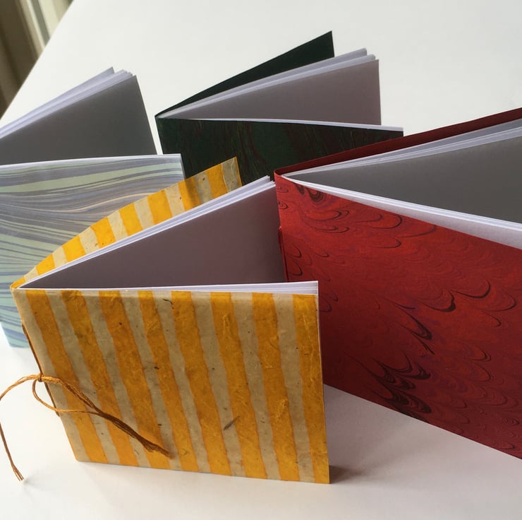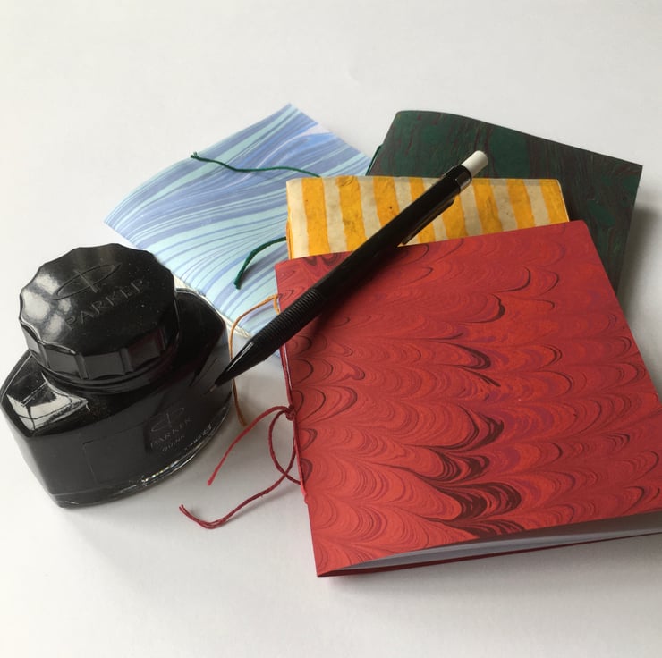 A pack of four little notebooks in four different colours: pale blue, green, red and yellow. (Three are covered in hand marbled paper and one in a lovely yellow & cream striped paper.) They measure 10 x 10cm and 10 x 9cm - just right for slipping into a pocket or handbag and useful for school and college work too. They have 24 pages (48 sides) of good quality plain white paper.