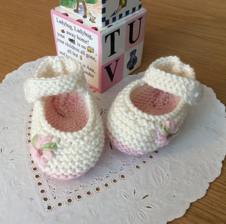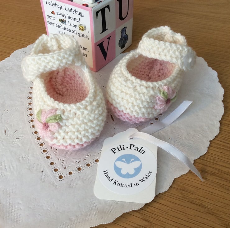 These soft little shoes were hand knitted by me. They are knitted in a cashmere blend wool that is soft for babies feet but can also be machine washed at 30 degrees.