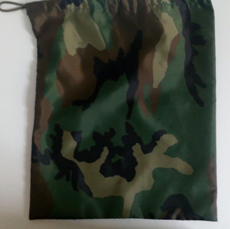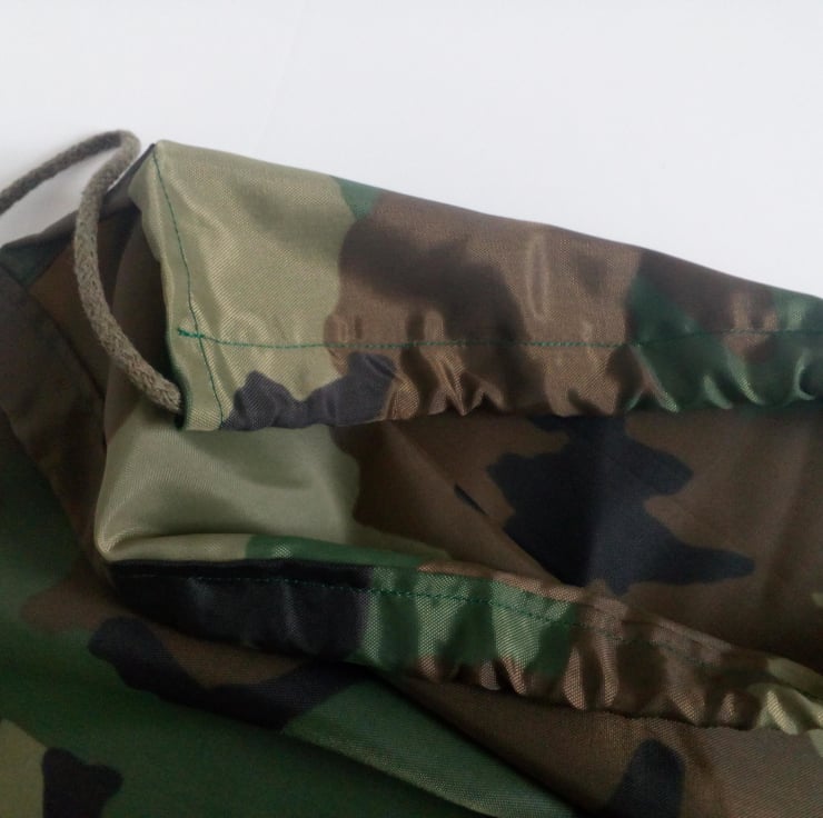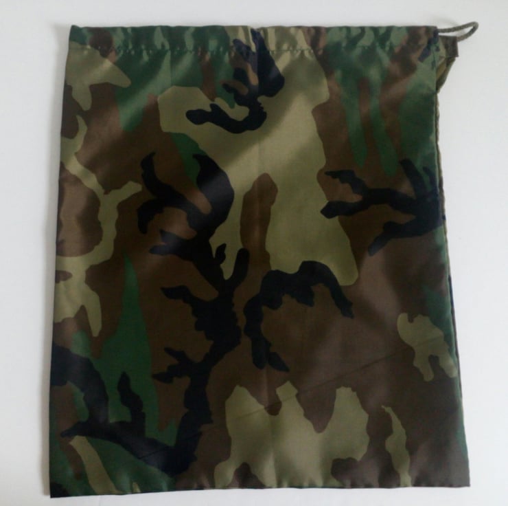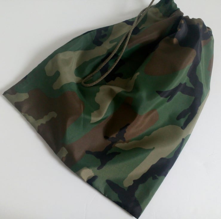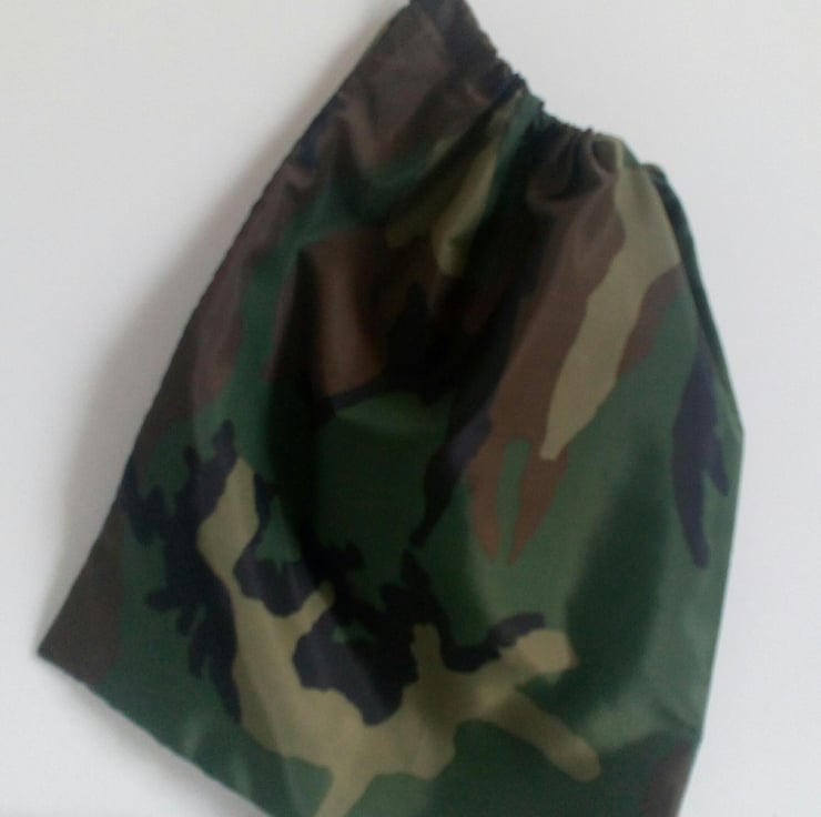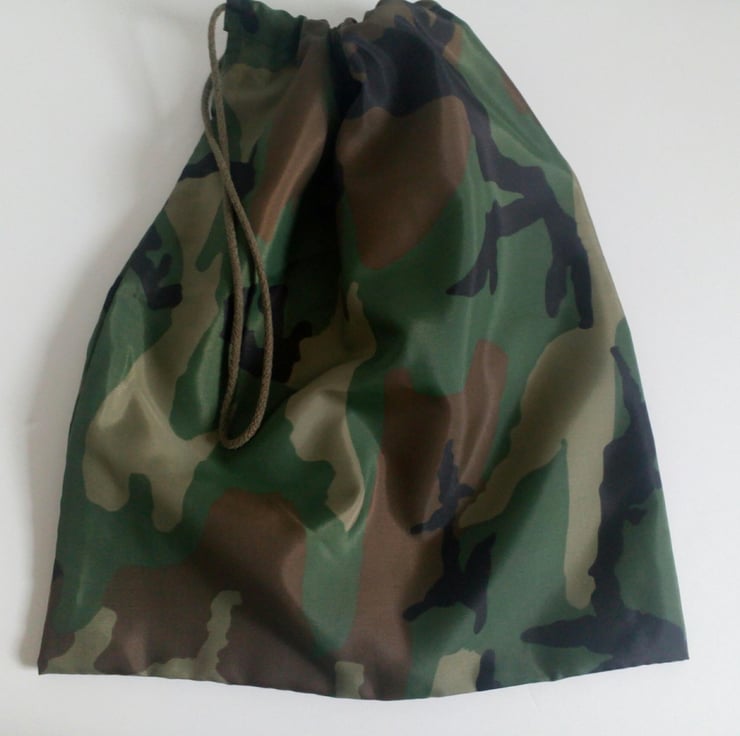 A Drawstring bag with an army green camouflage design in ripstop nylon fabric. Sturdy and lightweight.