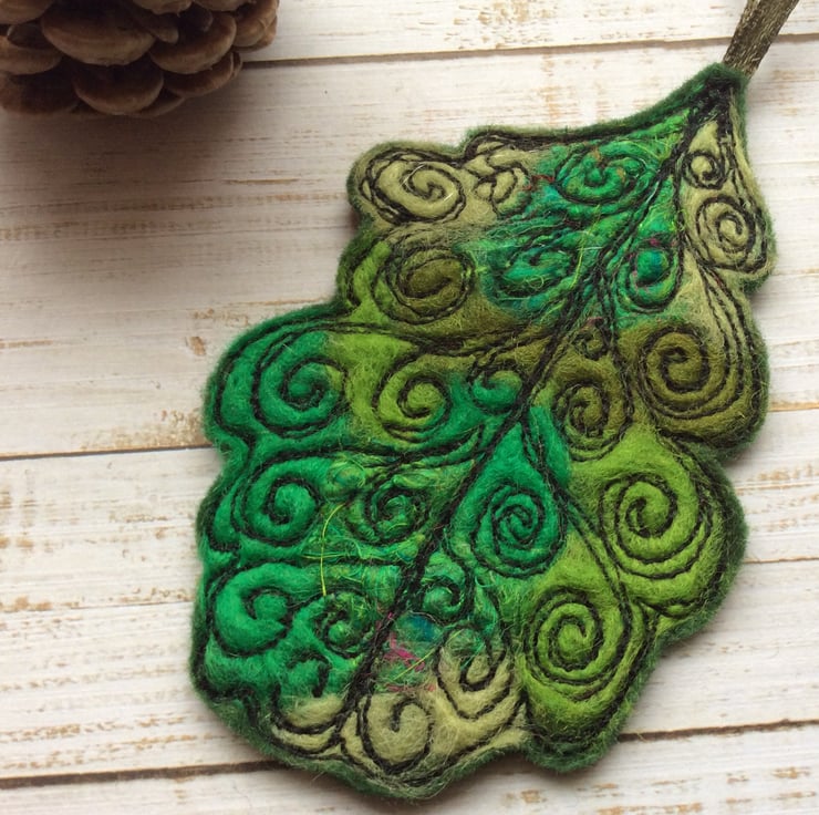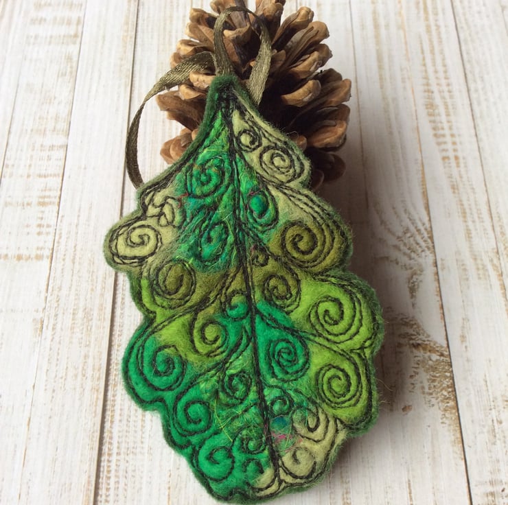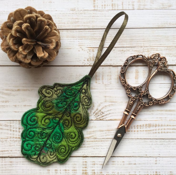 My oak leaf decoration has been made with merino wool, silk and felt. All sewn down with free motion embroidery. It’s felt backed with an up cycled ribbon. It measures 9cm x 6cm approx, and with the ribbon the length is 16cm.