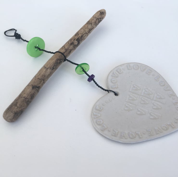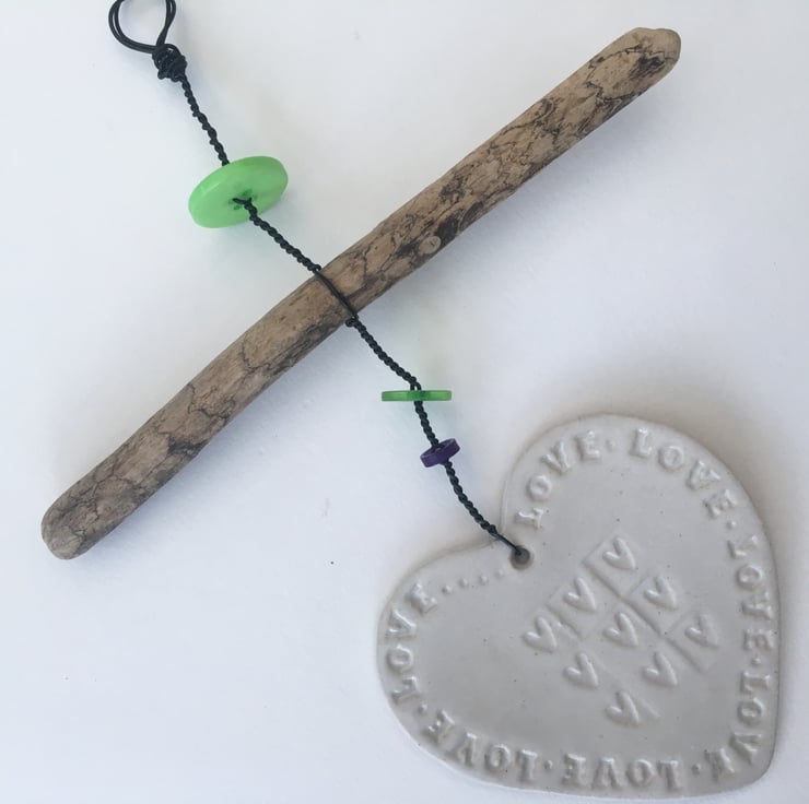 Driftwood wall hanger, This pretty Driftwood, Loveheart hanger is made using a black wire, clay, driftwood and some cute buttons to create a beautiful one off design.