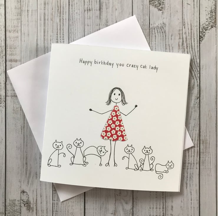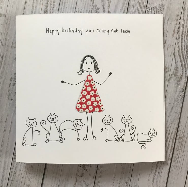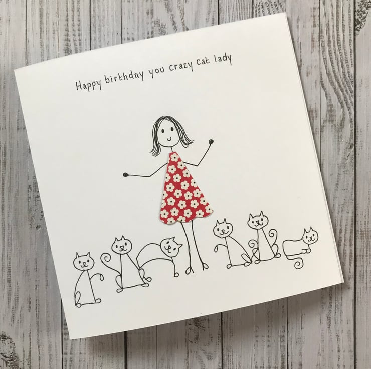Hand drawn personalised birthday card 'Happy birthday you crazy cat lady'