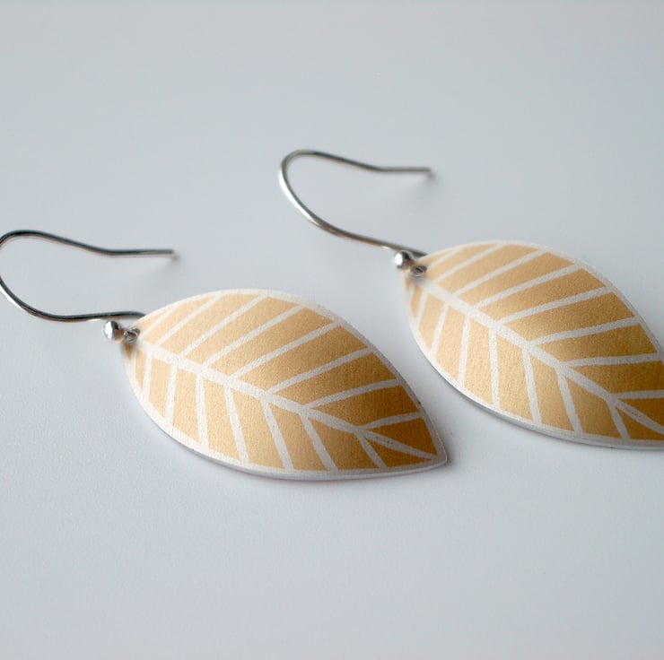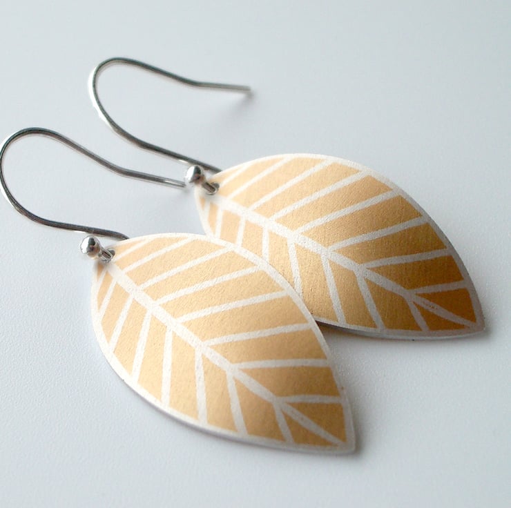 These orange leaf earrings are made from anodised aluminium which I have dyed in a pale orange and printed with a silver leaf print. I hand cut the leaf shapes using a piercing saw and file the edges to give nice clean lines and smooth edges. Finally, the leaves are domed slightly so that they catch the light nicely. The leaves measure approximately 27mm x 13mm and hang from sterling silver ear hooks.