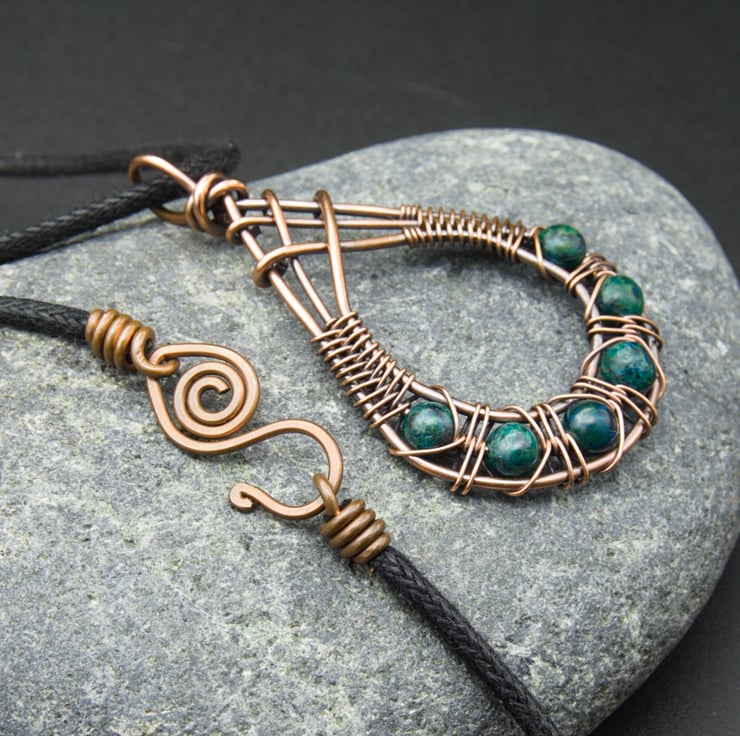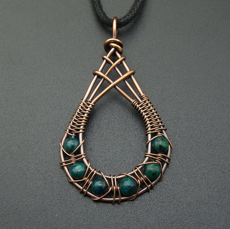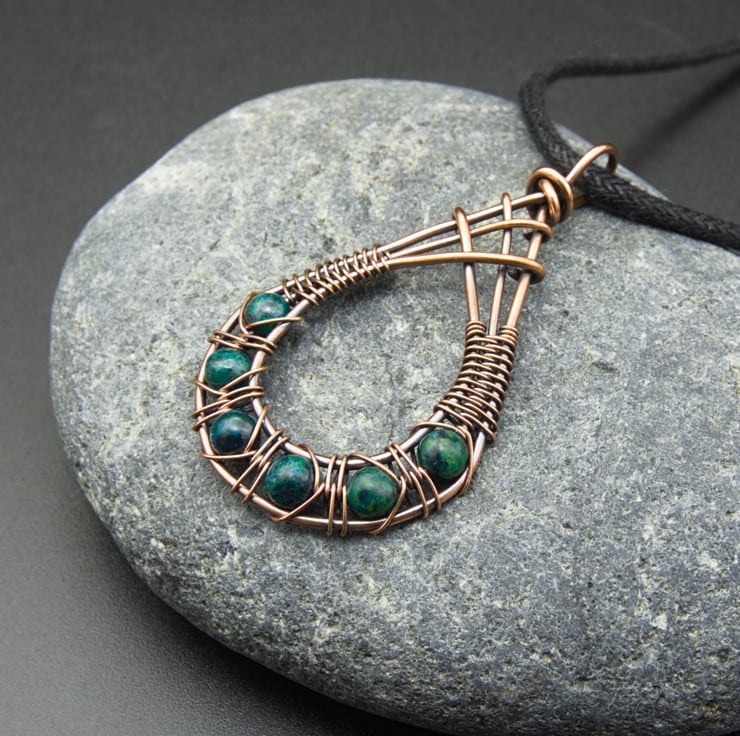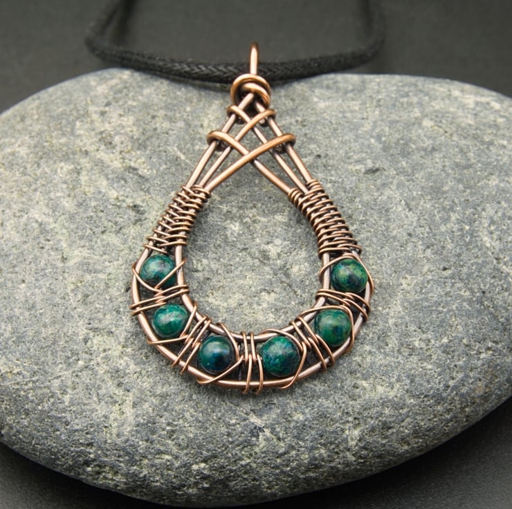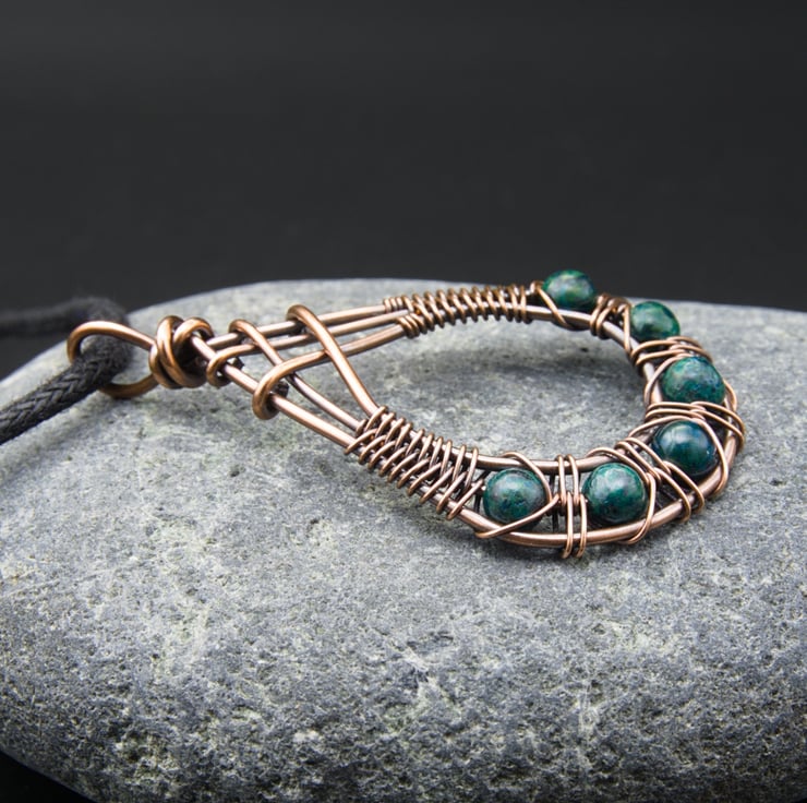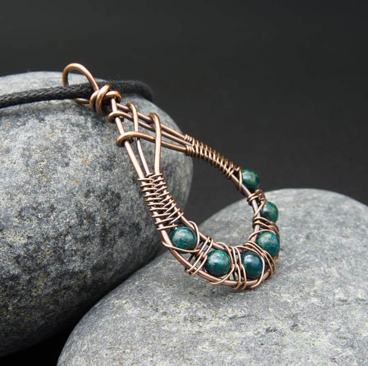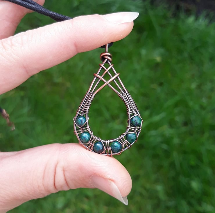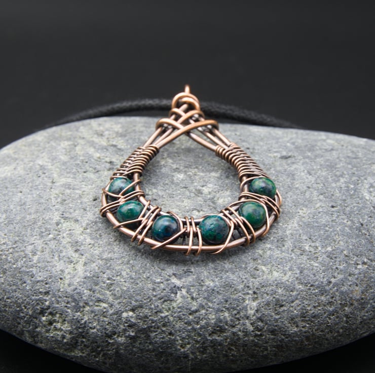 This sweet little pendant is completely handmade from copper wire & features 4mm round Chrysocolla beads. I've woven a simple band including six beads, each separated by two rows of weaving, which has then been formed into a teardrop shape. The wire ends have been fishtailed, creating a pretty criss-cross detail at the top to finish the design. Chrysocolla is a beautiful mottled green-blue stone which looks stunning with copper.