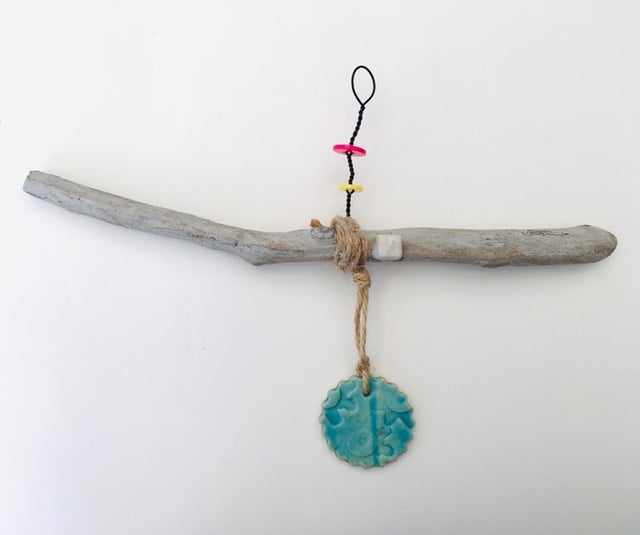 Driftwood wall hanger, clay charm, gift idea, birthday, unique pottery