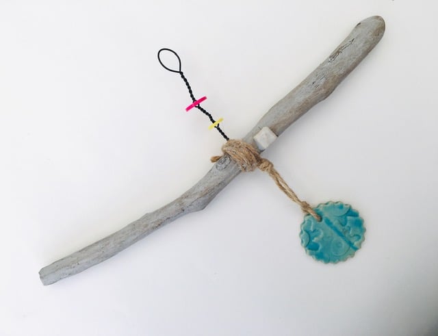Driftwood wall hanger, This pretty Driftwood, Ceramic hanger is made using a black wire, clay, driftwood and some cute buttons to create a beautiful one off design. It has a turquoise ceramic piece attached to natural twine which is then fastened onto the driftwood.