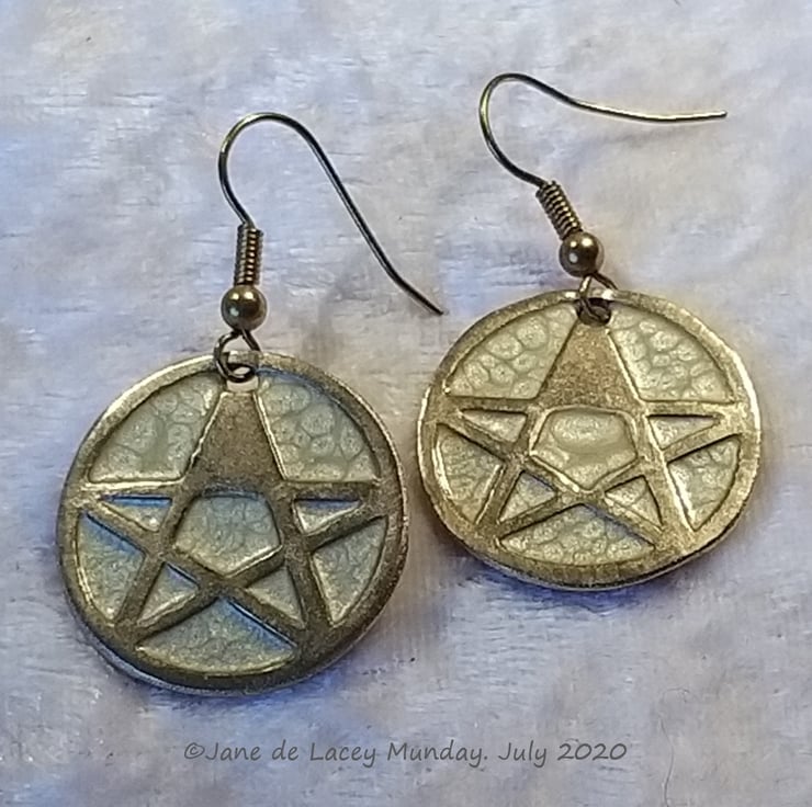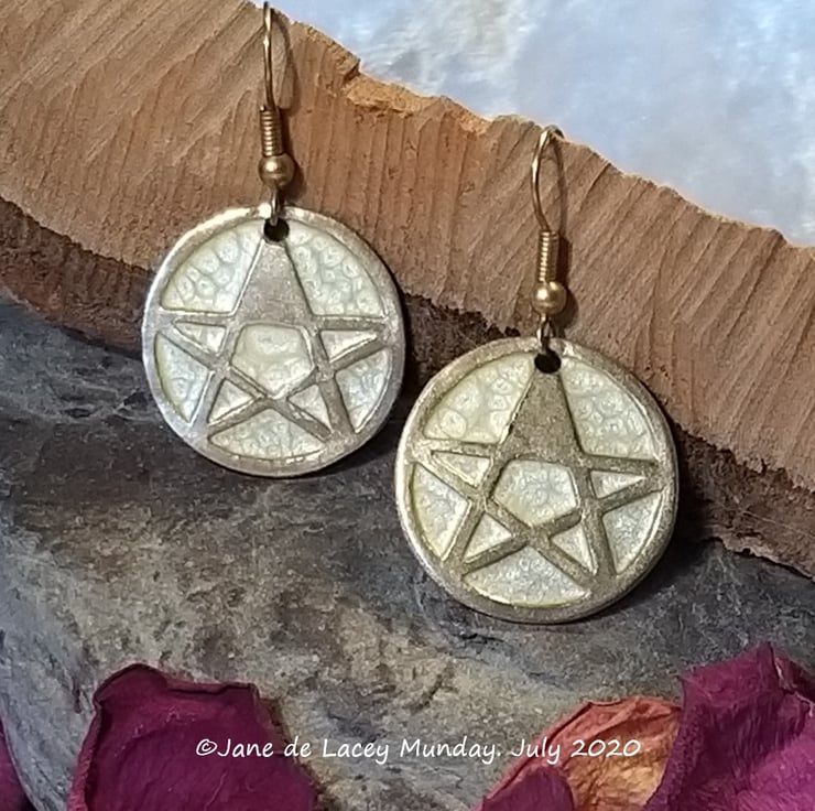 Handcrafted in bronze metal clay, these pentagram earrings have been finished with an ivory cell effect cold laquer enamel. On gold plated earwires.