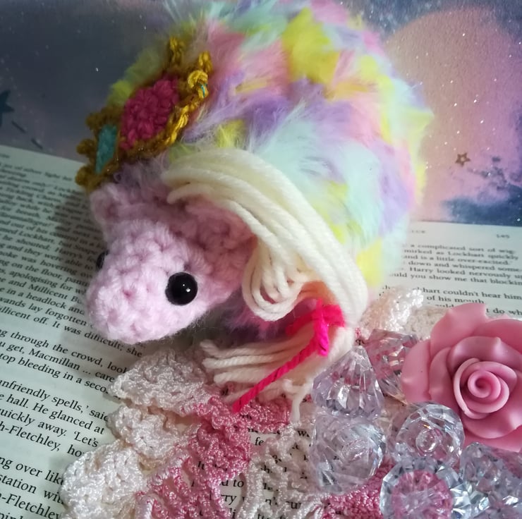 This pygmy puff is based on Luna Lovegood, she has pretty blonde hair tied in a pink bow and spectrespecs on her head.