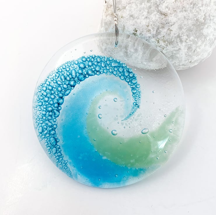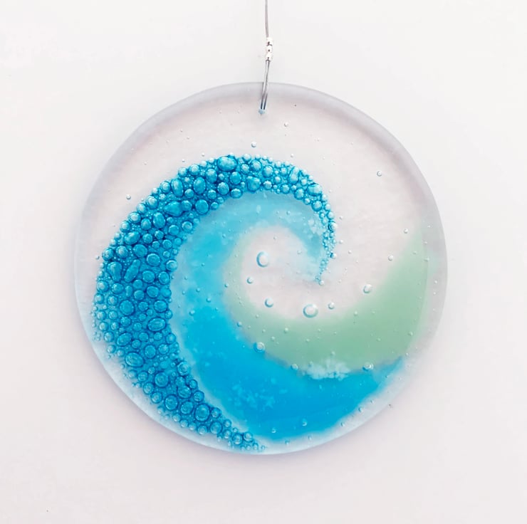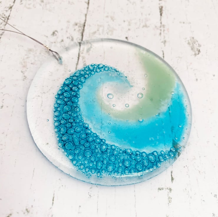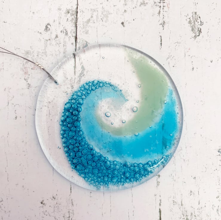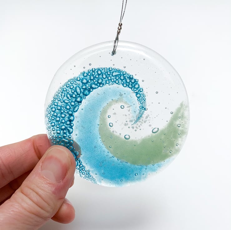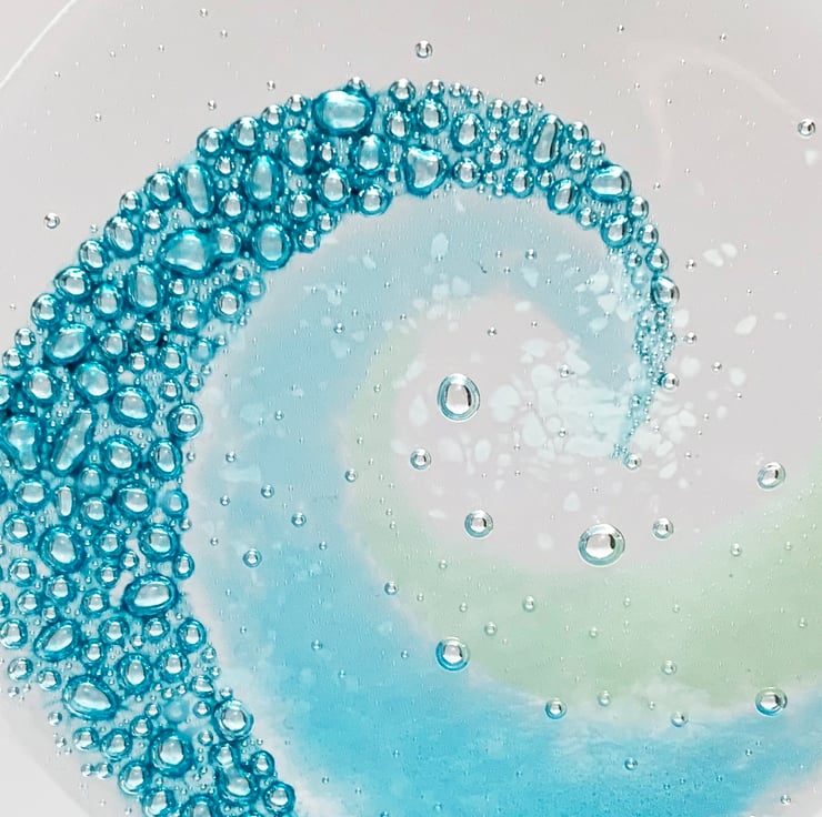 I hand cut art glass into 2 circles and use specialist paints and powdered glass to create my wave design. I then fuse it overnight slowly in my kiln. In the heat of the kiln, the specialist paint changes into hundreds of tiny turquoise bubbles.