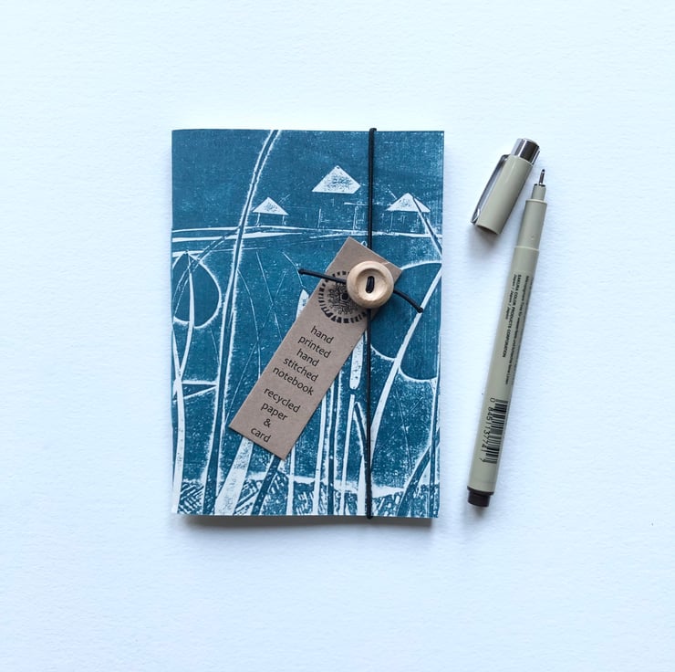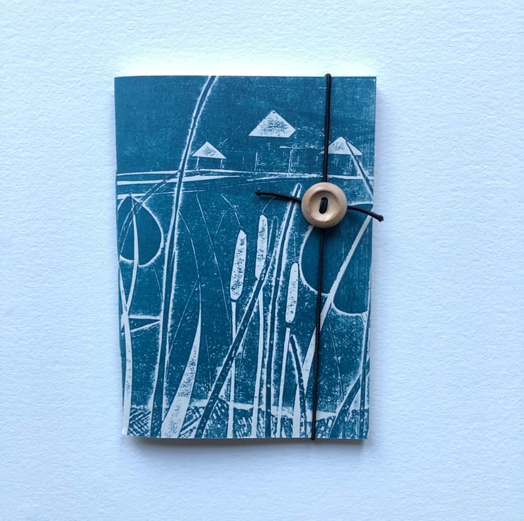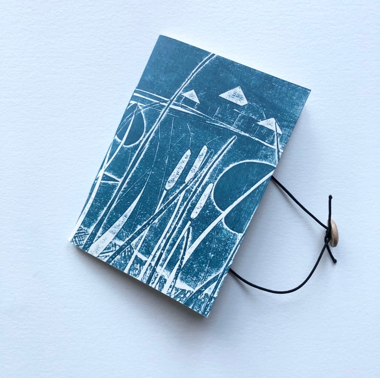 This soft backed pocket sized notebook measures approx 14cm by 10.5cm and features a hand printed outer cover in a dark Prussian Blue. The print is taken as a relief print from my original Collagraph plate Towards Fitzwilliam Cottages, which are a beautiful row off old farm cottages near where I live.