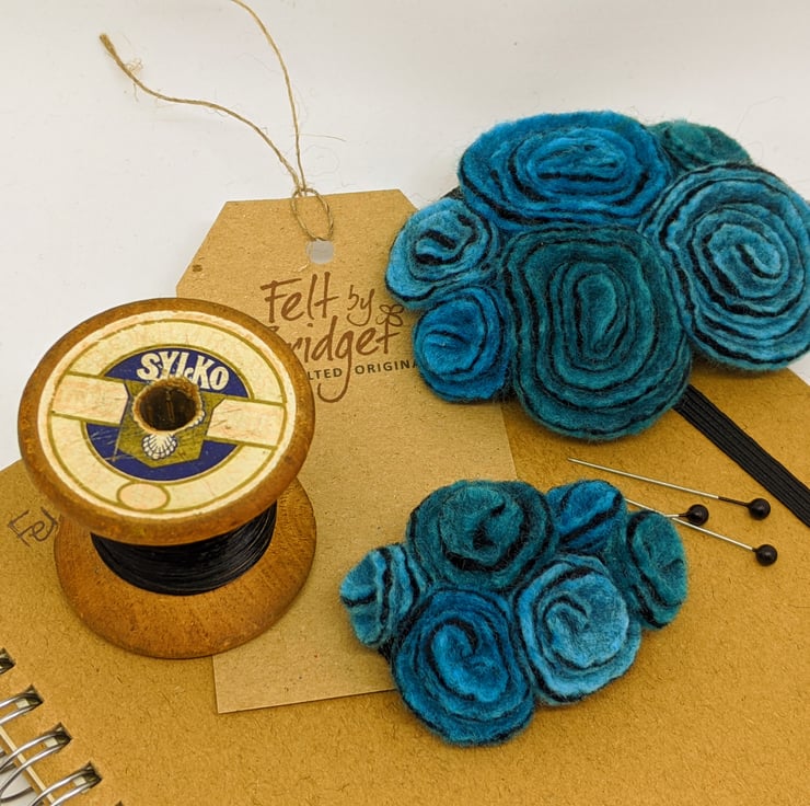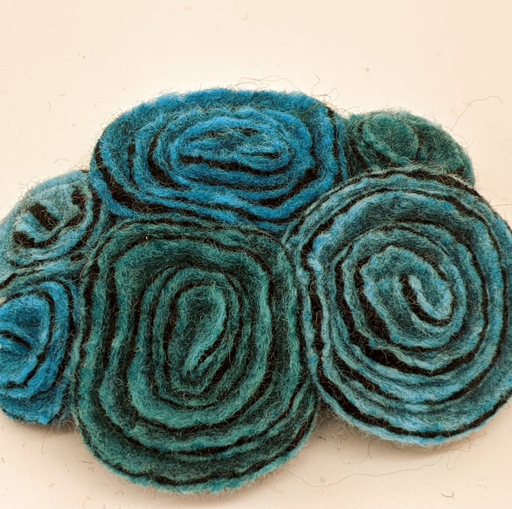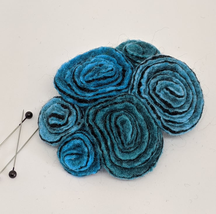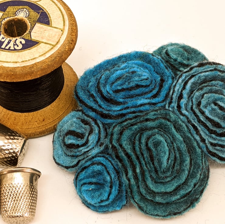 I have used three shades of turquoise (bright blue, jade and turquoise) to make a cluster of felted roses.