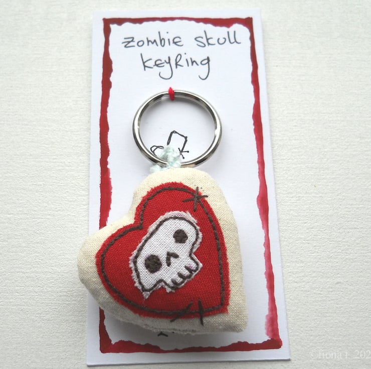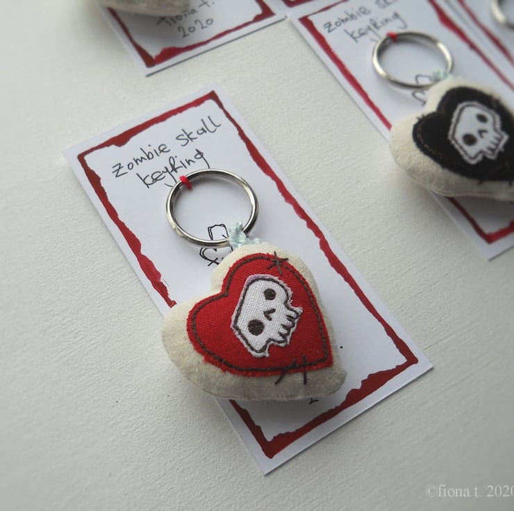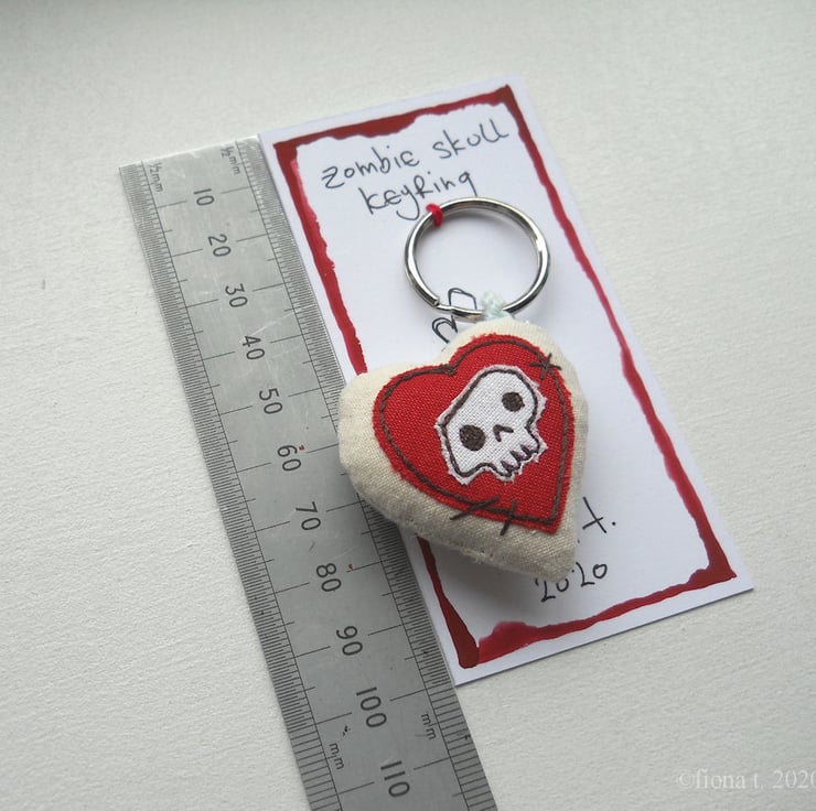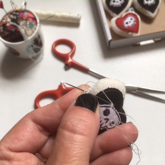 a tiny white cotton skull layered on a red heart is appliqued & embroidered freehand onto cotton calico.