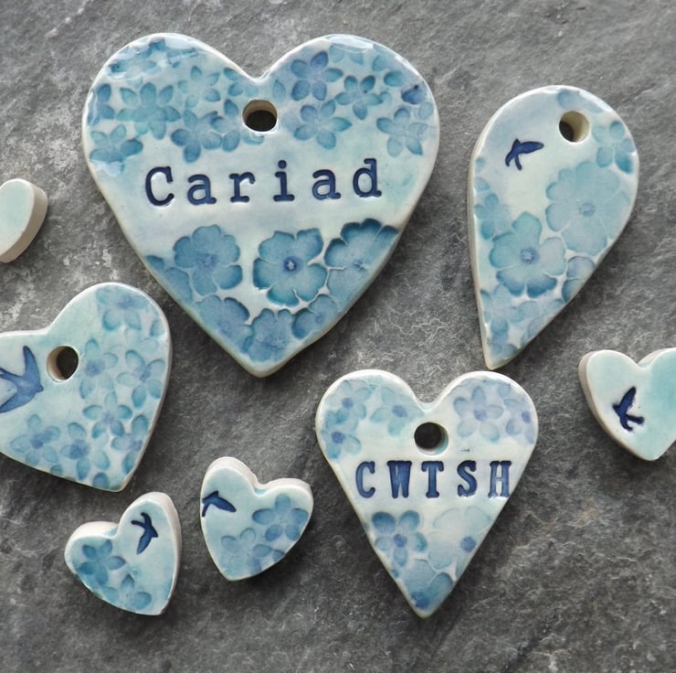 After forming the drops from fine white clay, I imprinted the design. When dry, I sanded the sides and rounded off the edges to ensure they are super smooth to the touch. They then had their first firing. Next I painted them using under-glazes and applied a transparent glaze before firing again to earthenware. The ceramic is glazed on the front and sides so is very smooth whilst retaining the texture of the imprinted design. The result is a pleasantly tactile item. The drop is securely glued to a silver plated bail.