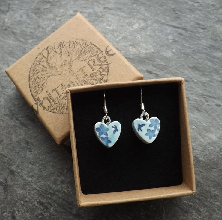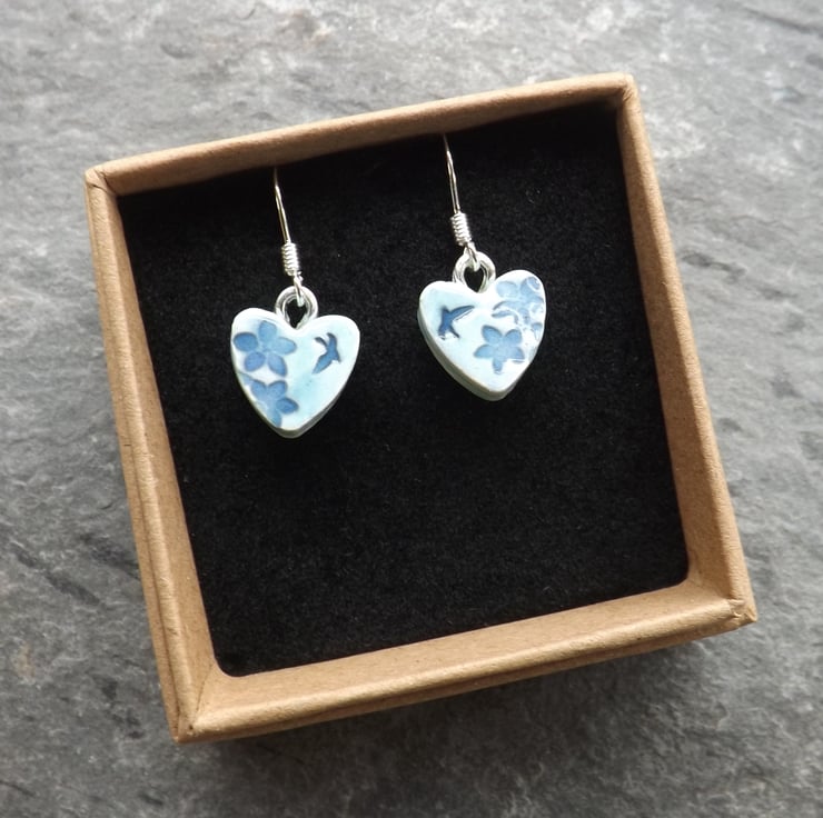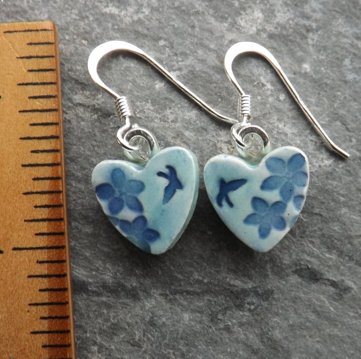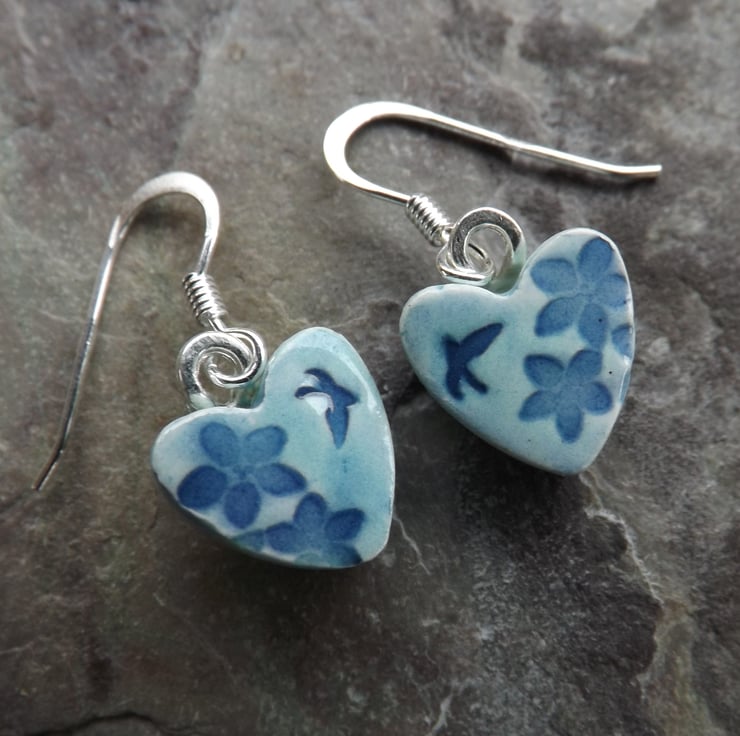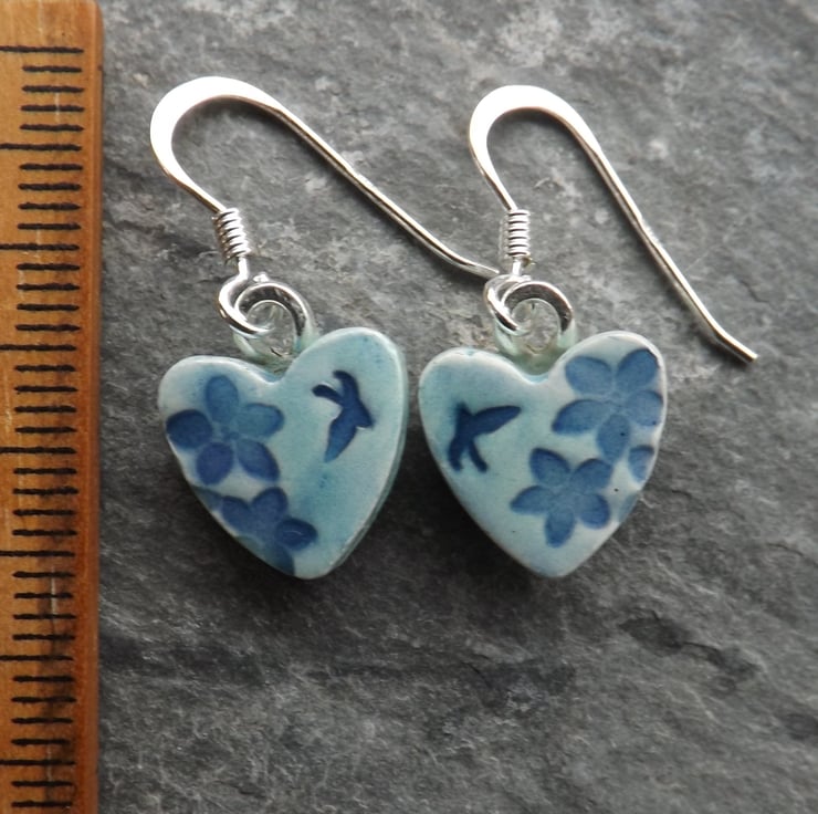 These pretty earrings have birds and flowers stamped into the wet clay, and a wash of turquoise and blue over the background.