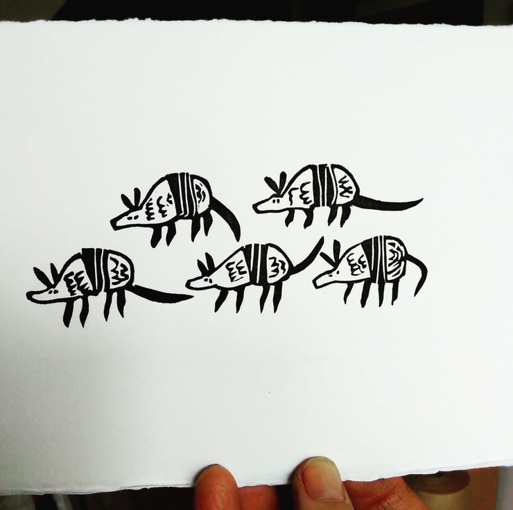 Five Three-banded Armadillos - lino cut print