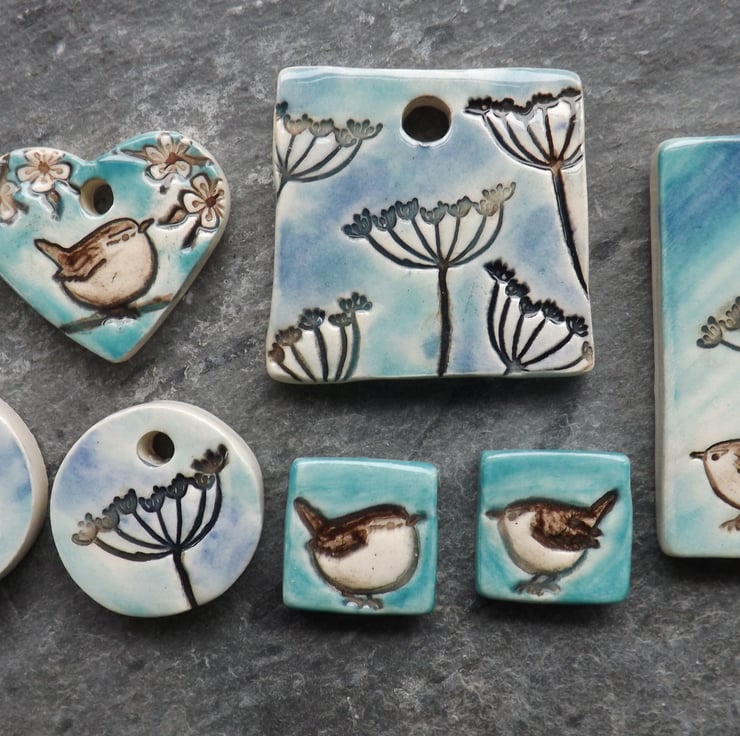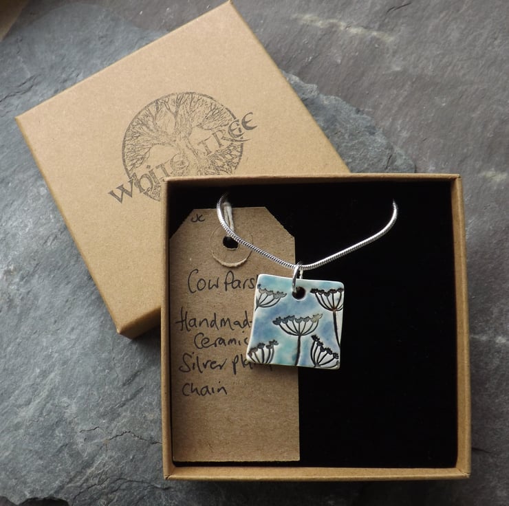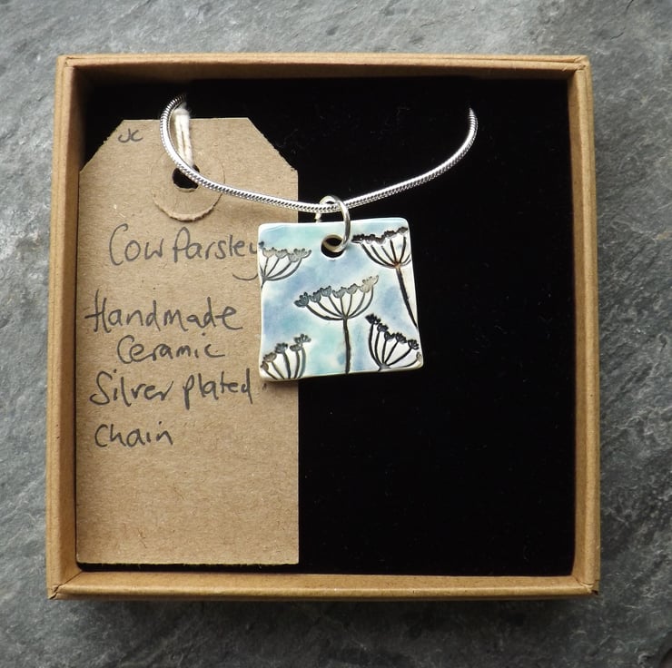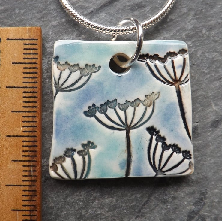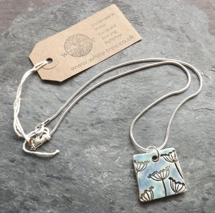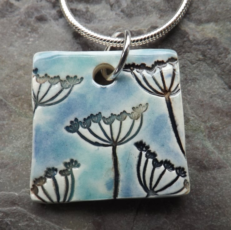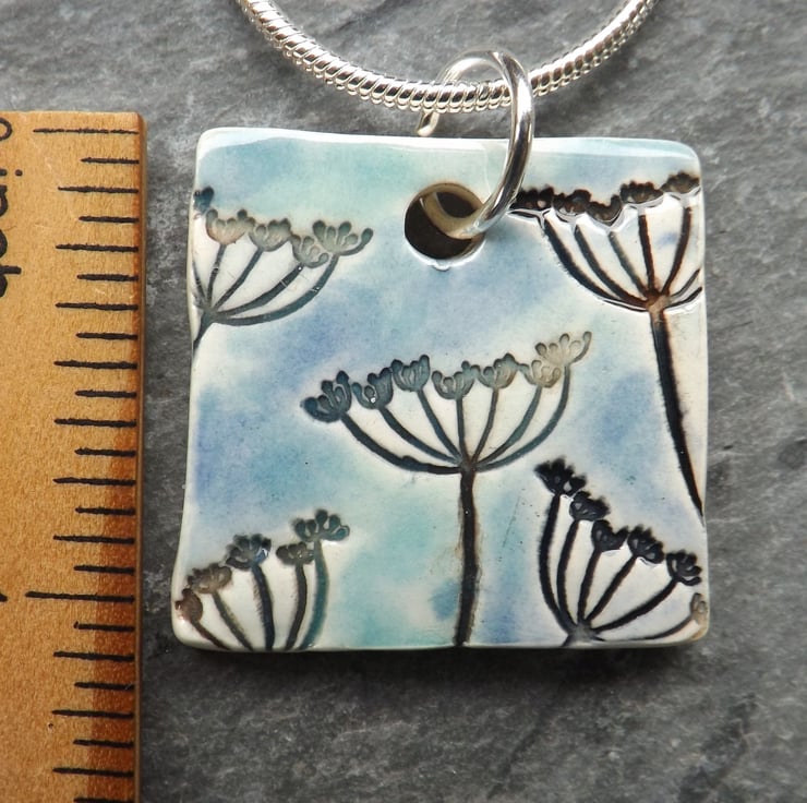 This pendant has a design of cow parsley stamped into the wet clay, and a background of soft blue and turquoise. As with all my jewellery it is made and decorated entirely by hand.
