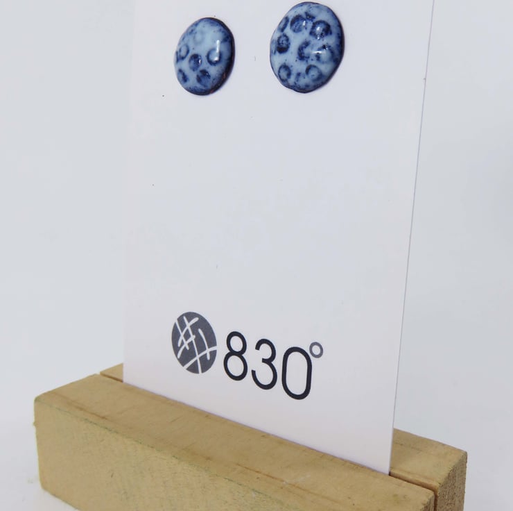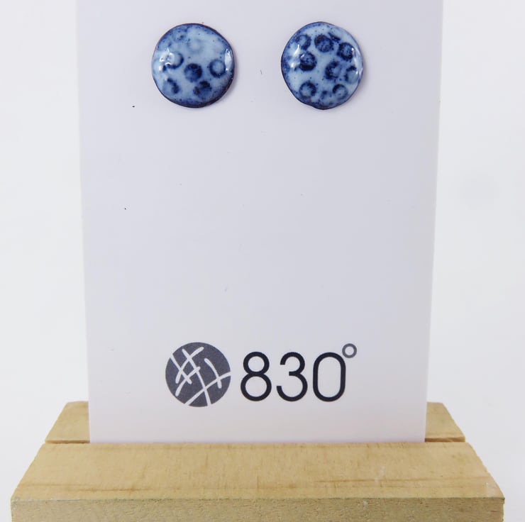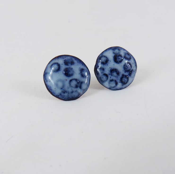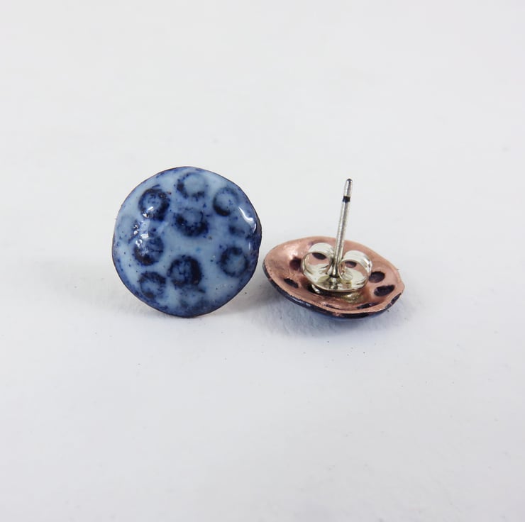 14mm circle copper stud earrings have been textured and a layer of dark blue enamel painted on before firing in the kiln. A second layer of light blue white has then been applied and fired again. The raised areas have stayed dark blue creating a polka dot type pattern. Silver posts are soldered on the backs. Fired in the kiln at 830 degrees. Posted out in a gift box with information about the enamelling process.