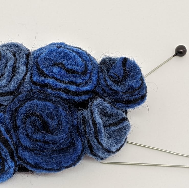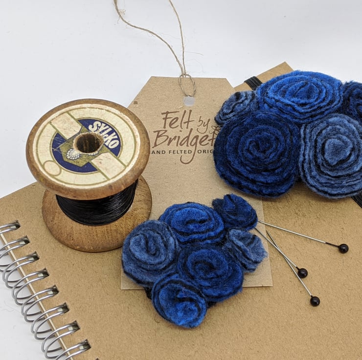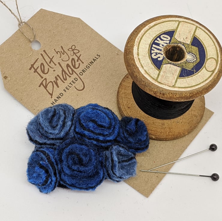 This is a smaller version of the vintage inspired brooch. I have used three shades of denim blue (mid blue, air force blue and cobalt, to make a cluster of small felted roses.