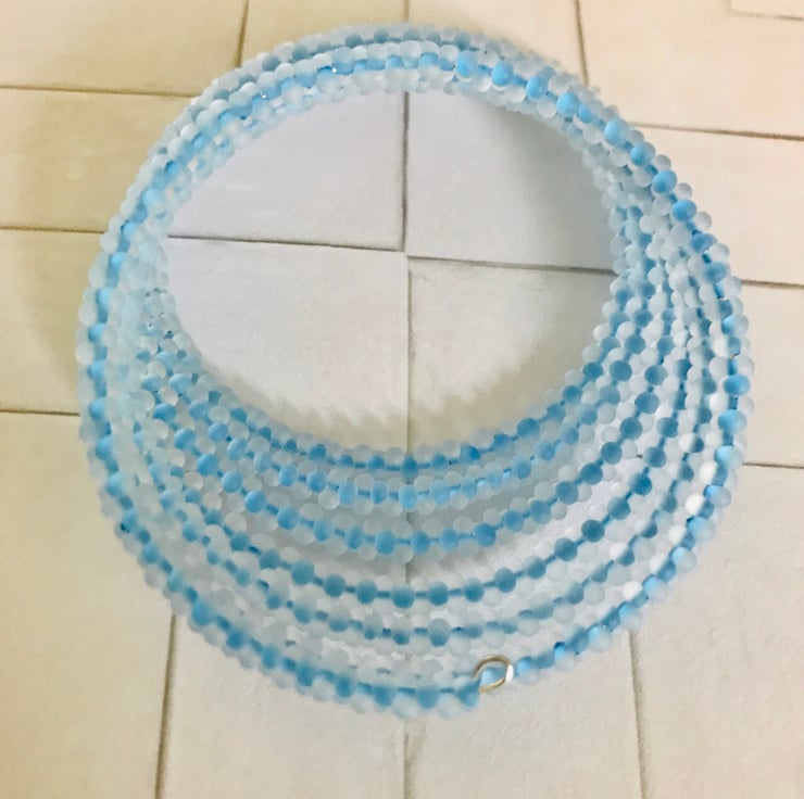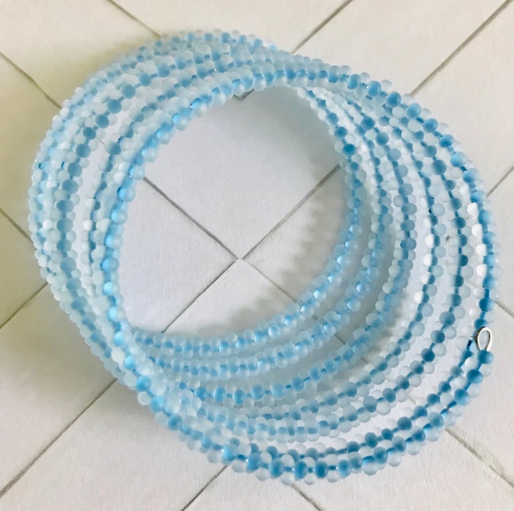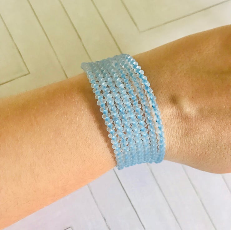 Beaded memory wire bracelet. Made with pale blue lined, clear frosted, farfalle rocaille beads.
