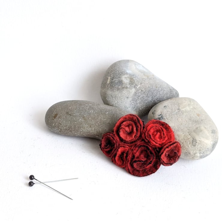 This is a smaller version of the vintage inspired brooch. I have used three shades of red (flame, ruby and poppy) to make a cluster of small felted roses.