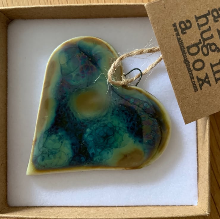The "a little hug in a box range" from Funky Zebra is a range of small thoughtful gifts for you to send in the post to let someone who you can't be with at the moment know that you are thinking of them. Each of these hearts is handmade in porcelain and glazed with a green tortoiseshell coloured glaze.The little heart is tied with natural twine and measures approx 5cm x 3cm.