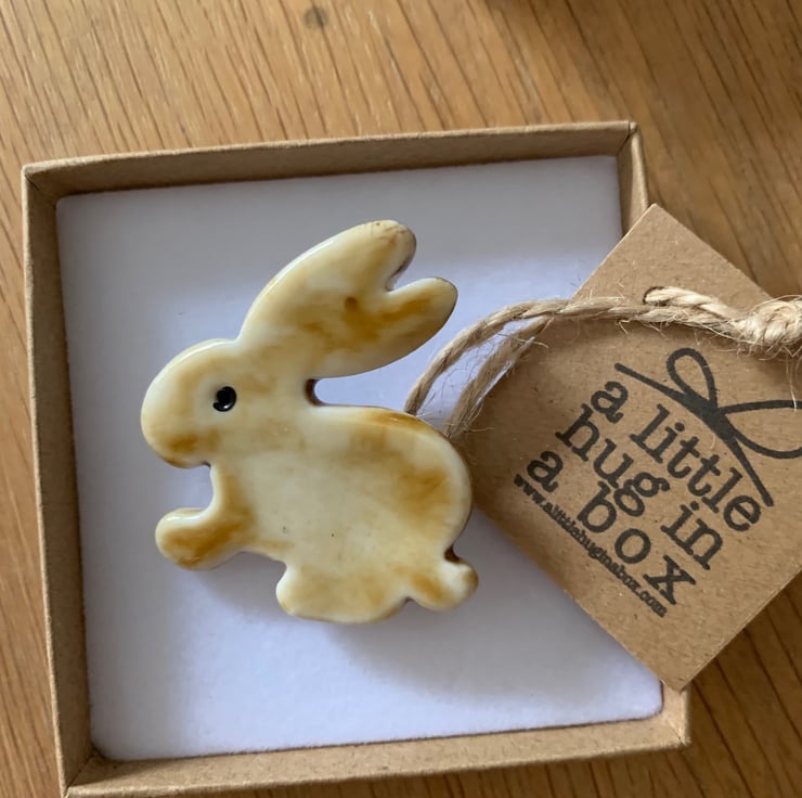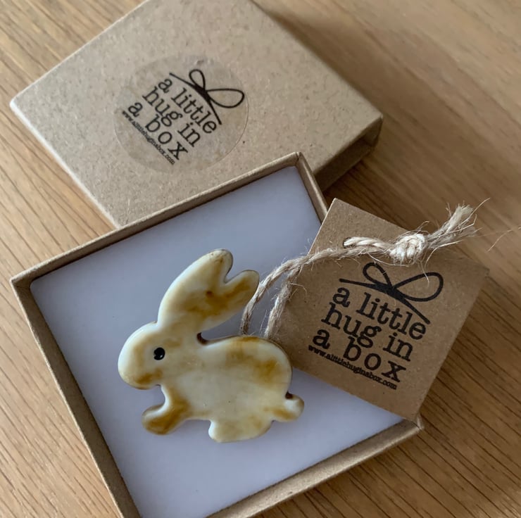 The little hug in a box range from Funky Zebra is a range of small thoughtful gifts for you to send in the post to let someone who you can't be with at the moment know that you are thinking of them. Each of these rabbit brooches is handmade in white porcelain which has been finished in a mottled brown glaze.
