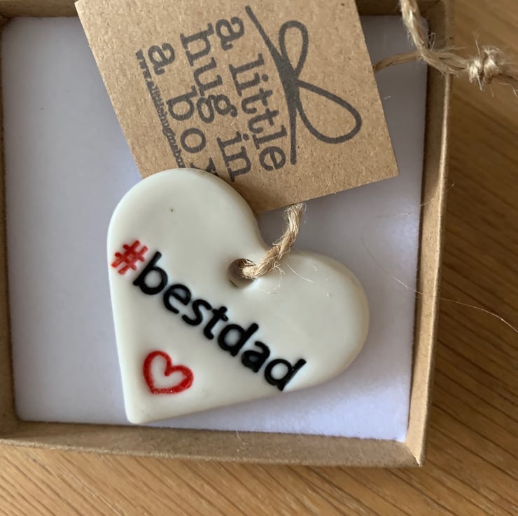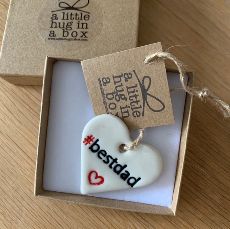 The little hug in a box range from Funky Zebra is a range of small thoughtful gifts for you to send in the post to let someone who you can't be with at the moment know that you are thinking of them. Each of these hearts is handmade in white porcelain with t he words Best Dad embossed and hand painted on the heart and measures approximately 3.5cm x 3.5cm. Please note that the postage cost includes the A little Hug in a Box gift box and tag