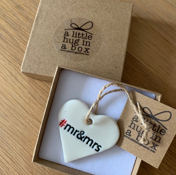 The little hug in a box range from Funky Zebra is a range of small thoughtful gifts for you to send in the post to let someone who you can't be with at the moment know that you are thinking of them. Each of these hearts is handmade in white porcelain with the words mr&mrs embossed and hand painted on the heart and measures approximately 3.5cm x 3.5cm. Please note that the postage cost includes the A little Hug in a Box gift box and tag