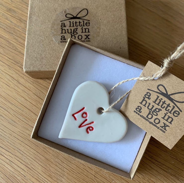 The little hug in a box range from Funky Zebra is a range of small thoughtful gifts for you to send in the post to let someone who you can't be with at the moment know that you are thinking of them. Each of these hearts is handmade in white porcelain with the words Love embossed and hand painted on the heart and measures approximately 4cm x 4cm. Please note that the postage cost includes the A little Hug in a Box gift box and tag