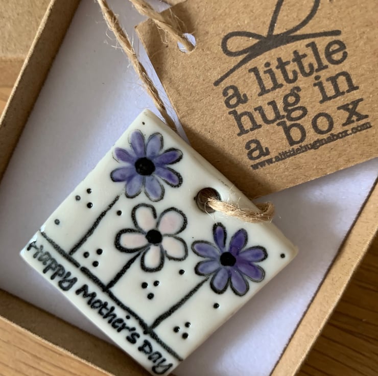 The little hug in a box range from Funky Zebra is a range of small thoughtful gifts for you to send in the post to let someone who you can't be with at the moment know that you are thinking of them. Each of these hearts is handmade in white porcelain and glazed with hand painted flowers in blue and the words Happy Mothers Day embossed and hand painted on. Each measures approximately 4cm x 4cm. Please note that the postage cost includes the A little Hug in a Box gift box and tag