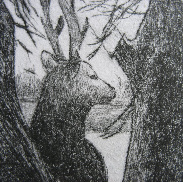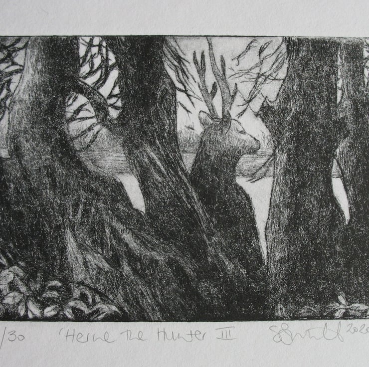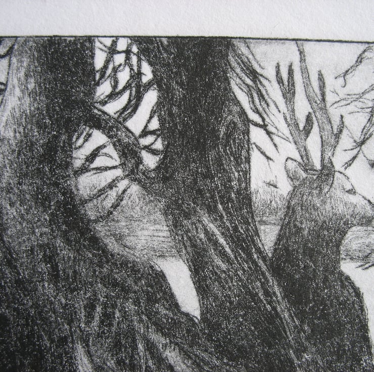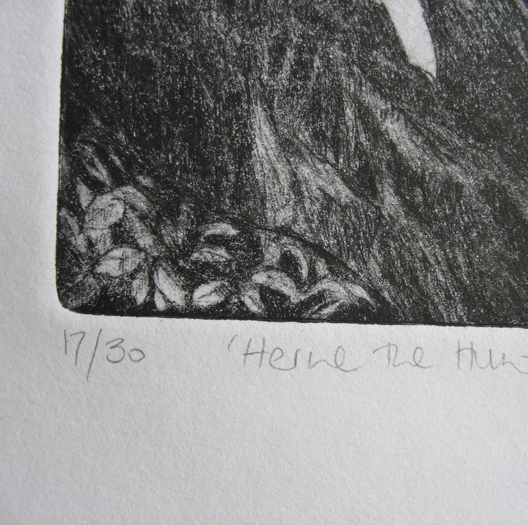 This sweet drypoint etching features Herne the Hunter in a grove of ancient trees. It is made from a plexiglass plate using fine etching tools and is printed with Akuo soy based etching ink on white paper. The printed image measures approximately 3" x 4". This is number 17 of a limited edition of 30.
