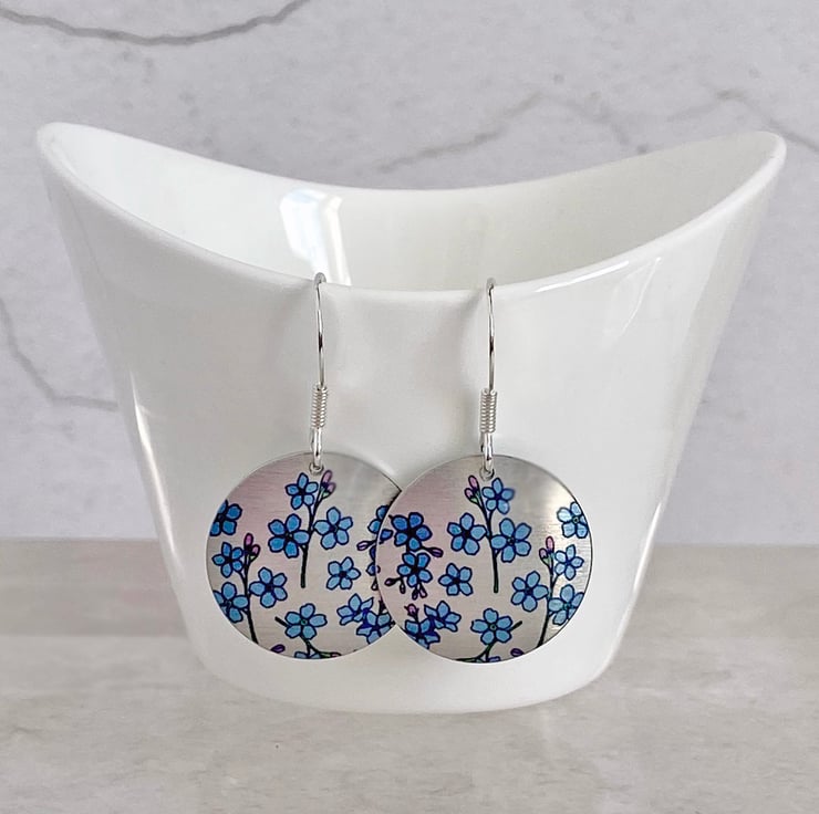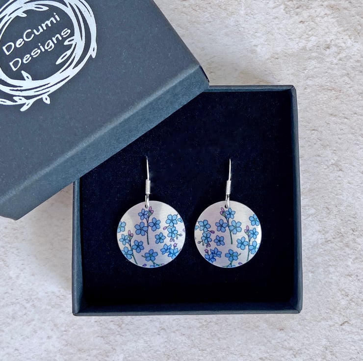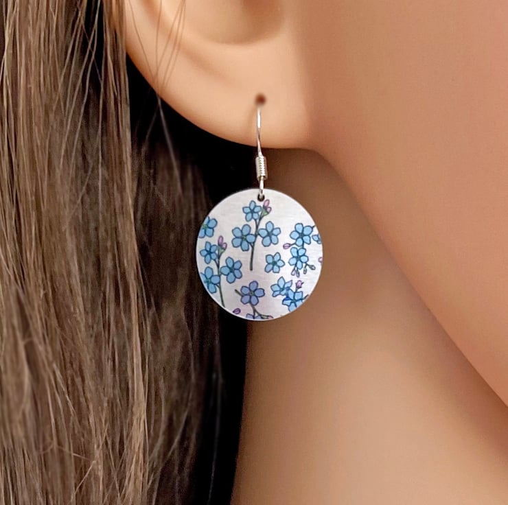 I have handmade the discs and artwork for these earrings, and the drops have a pretty blue Forget Me Not floral design. An ideal gift for nature lovers. Matching bracelet and pendant available.