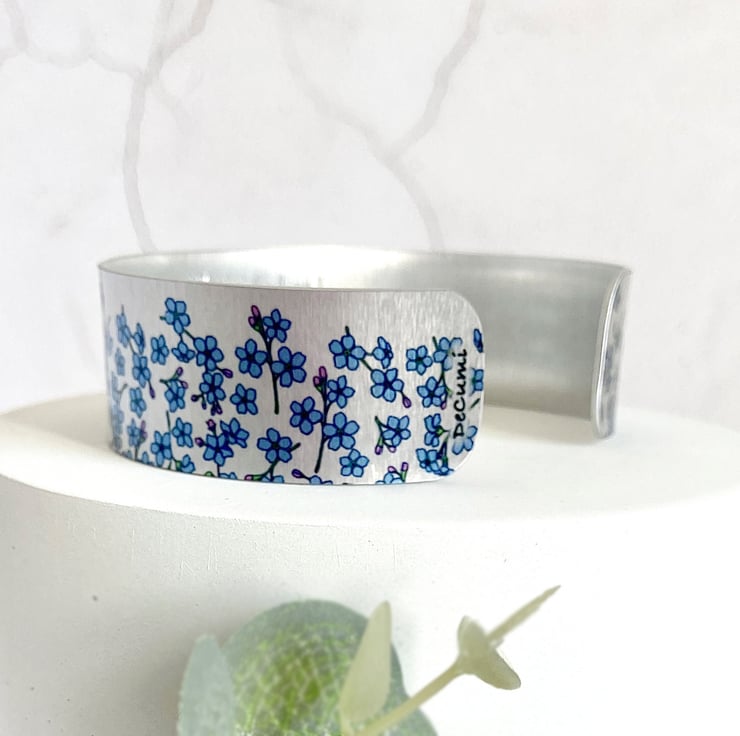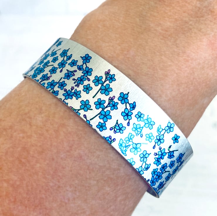 I have handmade this bracelet from aluminium and added a blue Forget Me Not design. Matching earrings and pendant available. This bracelet can have a personal message engraved on the reverse for small extra fee (optional).