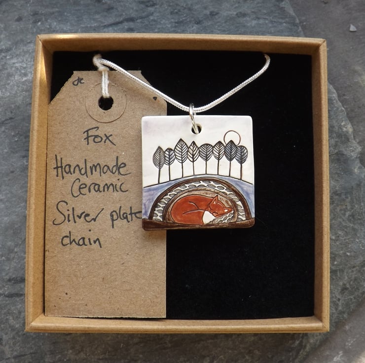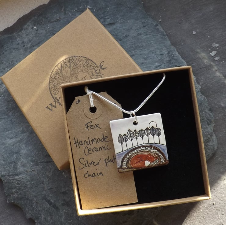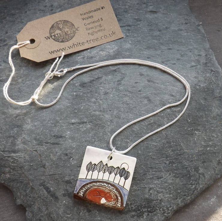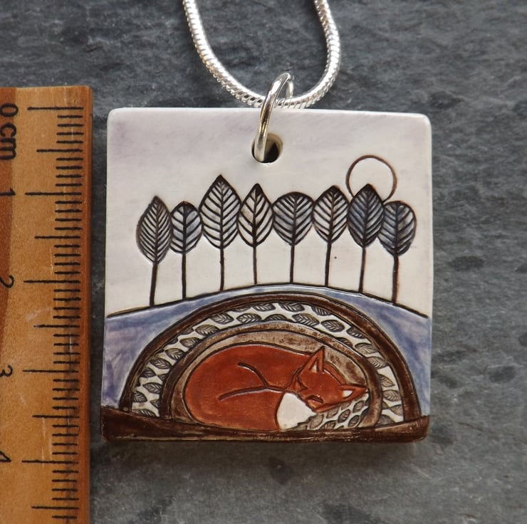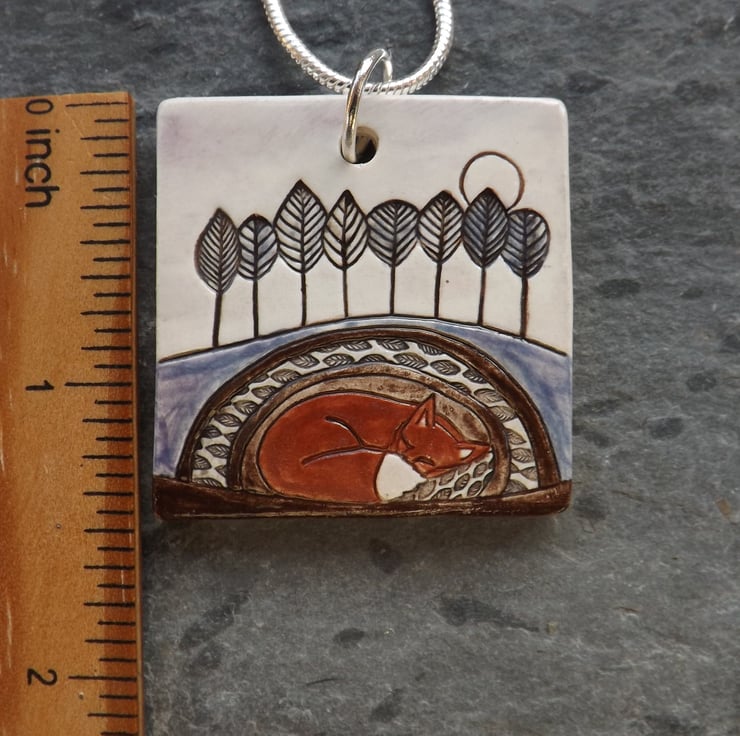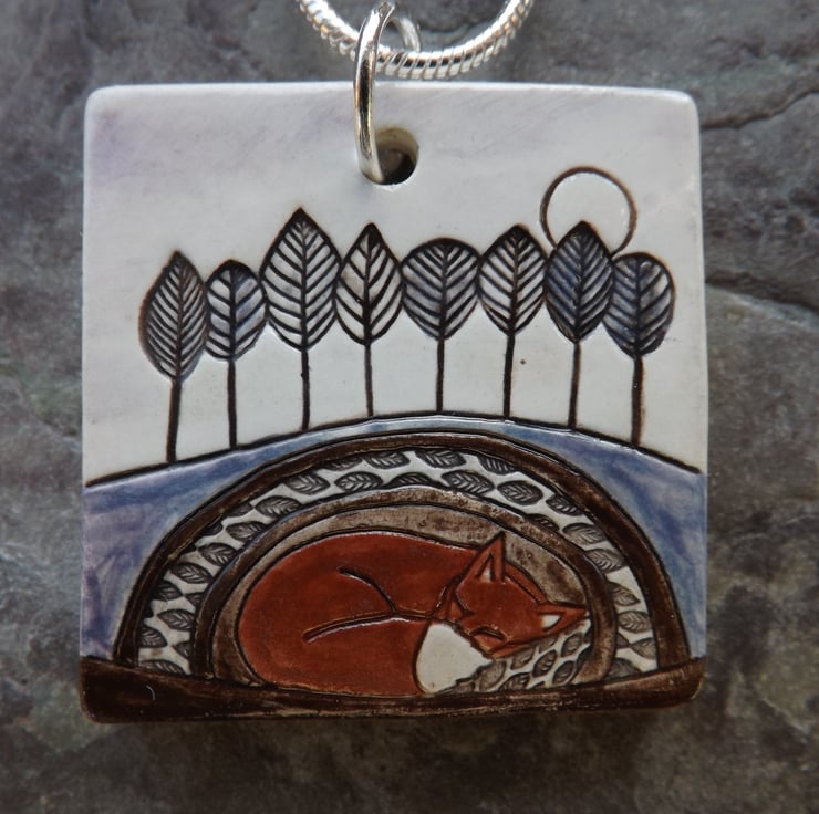 Beneath the trees and leaves, this little fox sleeps in his den. I have painted a soft mauve over the background and the trees are outlined in brown with shades of purple and mauve washed across. As with all my jewellery it is made and decorated entirely by hand.