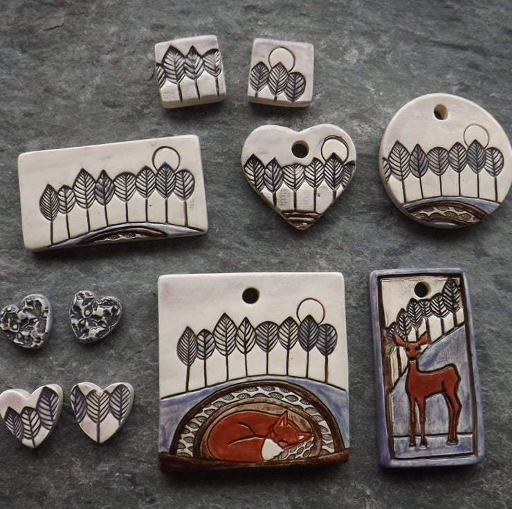 After forming my pendants from fine white clay, I imprint my design. When dry, I sand the back and sides of the pendants and round off the corners to ensure they are super smooth. They then have their first firing. Next I paint them using under-glazes and apply a transparent glaze before firing again to earthenware. Being glazed all over they are smooth against the skin whilst retaining the texture of the imprinted design. The result is a pleasantly tactile item.
