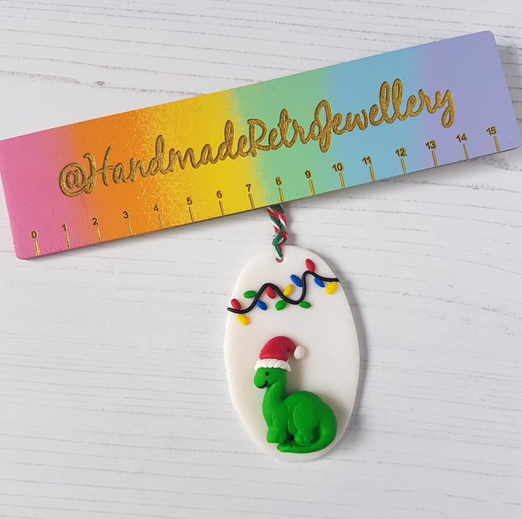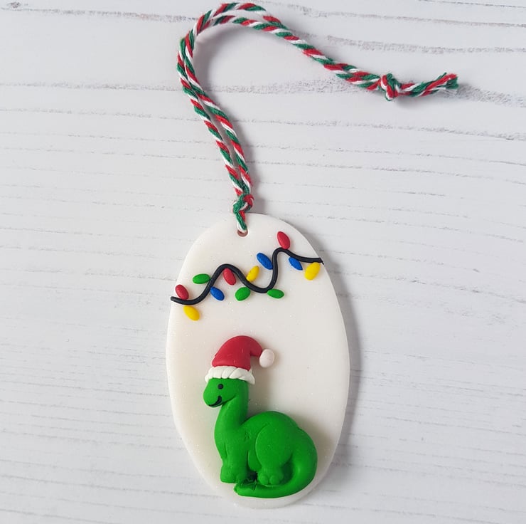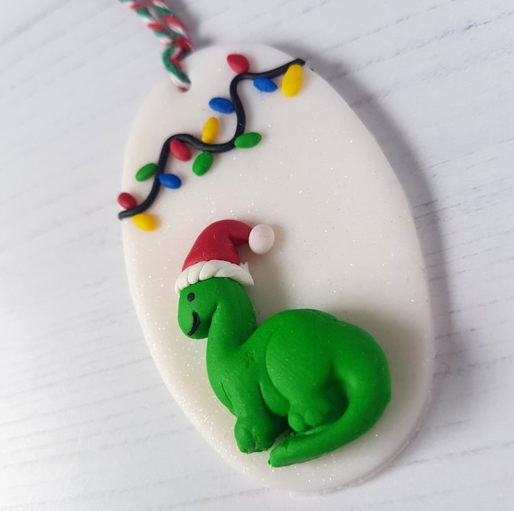 This cute little oval decoration is made of white glitter polymer clay, with a string of bright colourful christmas lights and a green dinosaur wearing a Santa's hat placed onto the top, to create a 3D effect! Great for any dinosaur lover at Christmas time!