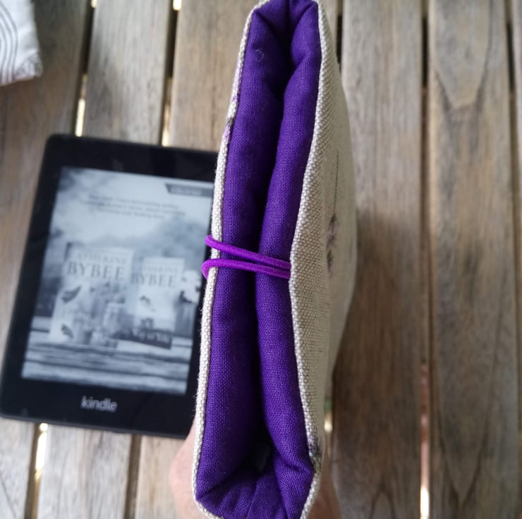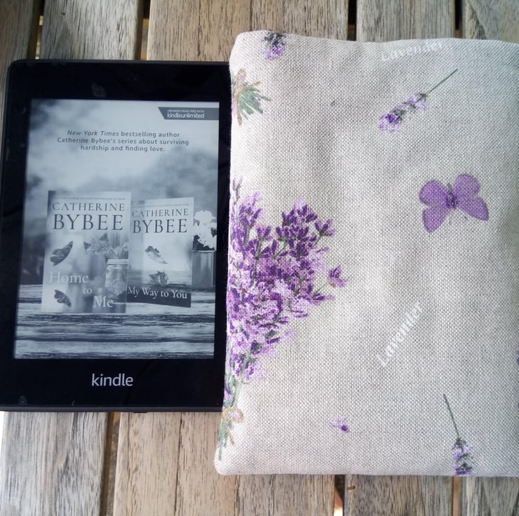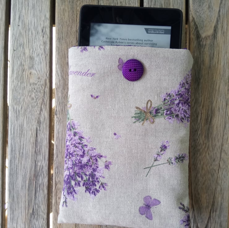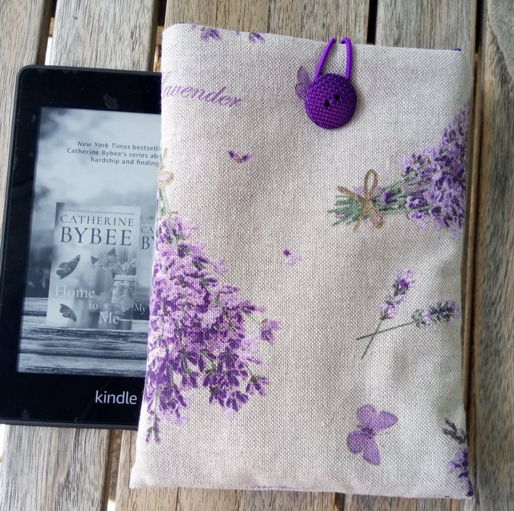 This is a handmade kindle case in a lovely linen blend fabric with a lavender design. There is a contrasting purple cotton lining and I have added polyester wadding to protect your kindle. It closes with an elastic loop over a button, to keep your kindle safe and protected whether it's in your bag,travelling or just in a drawer.