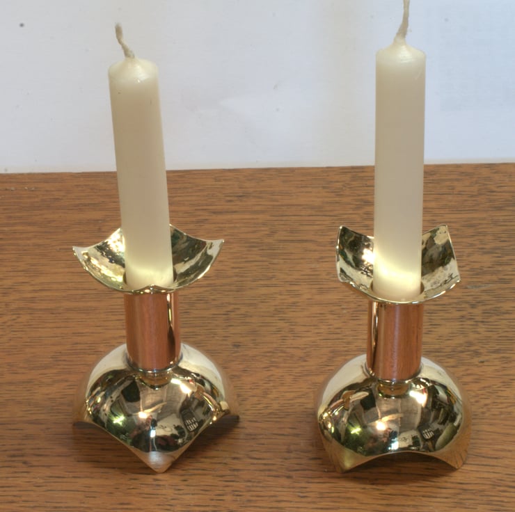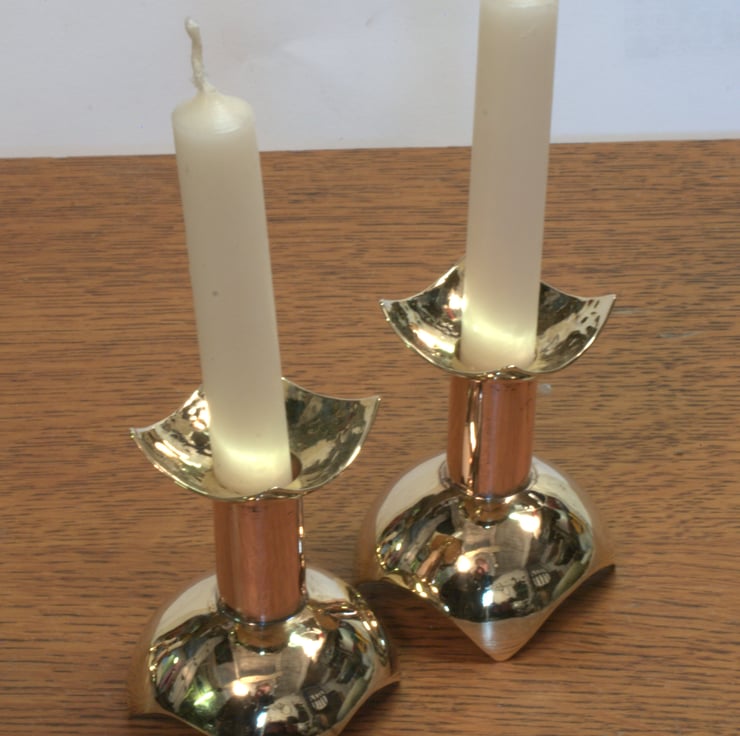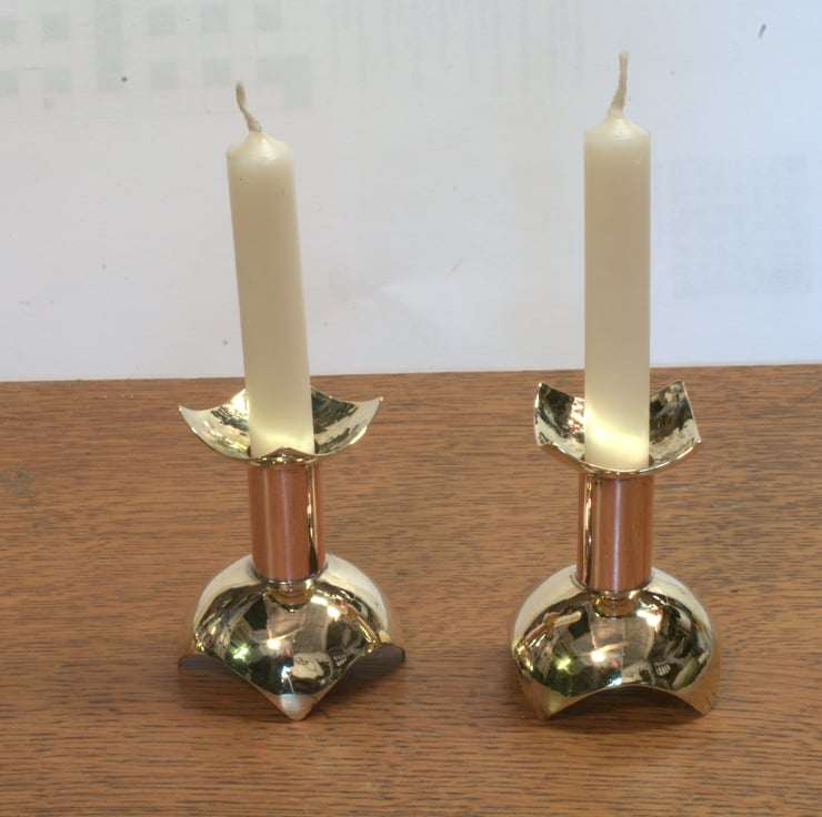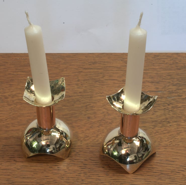 1pair of copper and bass candlesticks to take small candles (12mm/1/2"diameter).They are available as a pair but I can produce more to make a larger set. Height is 50mm.