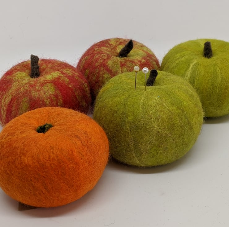 It is wet felted - wool, soap, water and a lot of rubbing and rolling, using five different shades of orange in the final stages to 'paint' the fruit.