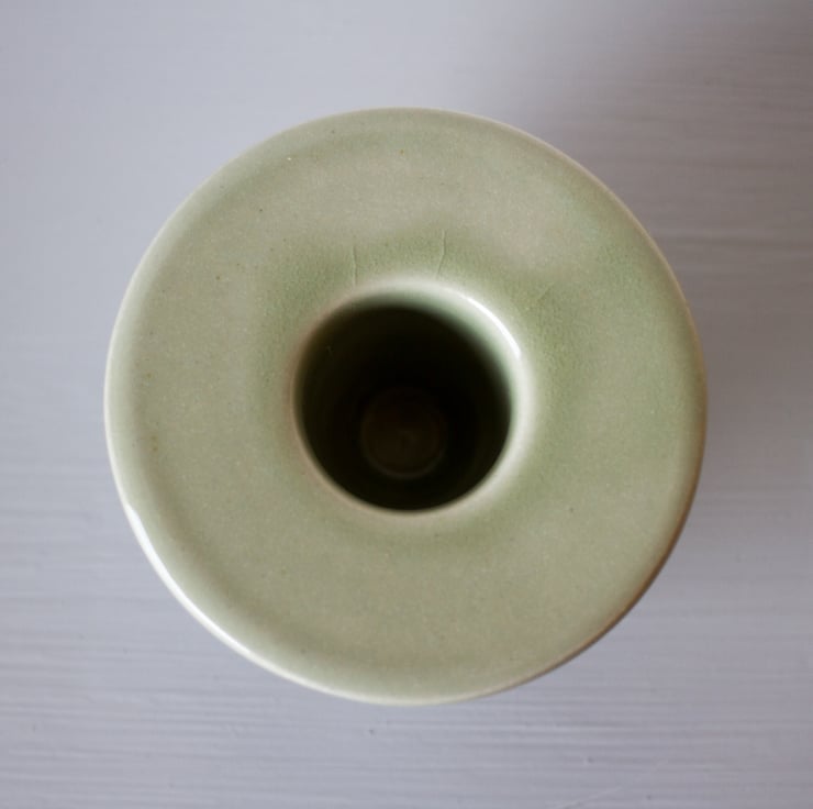 Thrown in one piece on the pottery wheel these vessels start life upside down where two walls are pulled up and joined together leaving an empty void in between similar to how a thermos flask looks. This is then manipulated to create the form shown. Further trimming refines the shape. It is then bisque fired, glazed and then fired up to 1280'C.