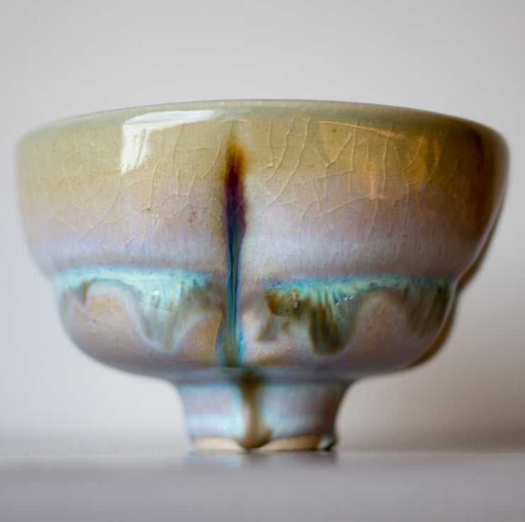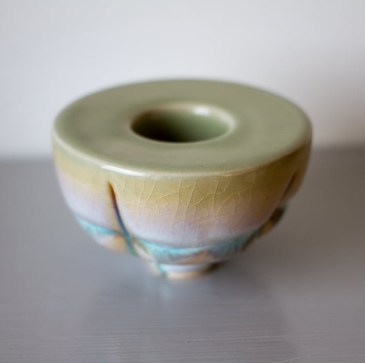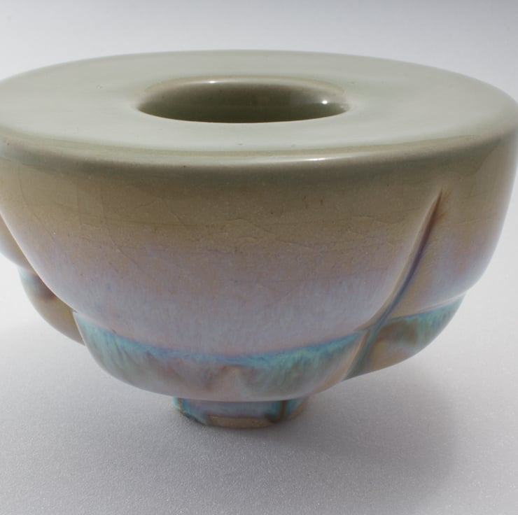Glazed on top with a pale green colour. The main body was painted along the creases in the clay with a glaze. This subsequently reacted with the transparent glaze applied over it thus creating lines and running patterns in white, light blue and brown hues which change with the light. The finished surface also has a crackle or crazed appearance to it. Not designed with any specific purpose but looks visually stunning on a shelf.