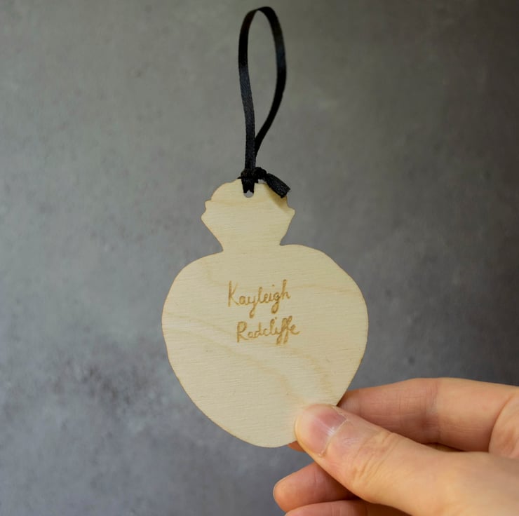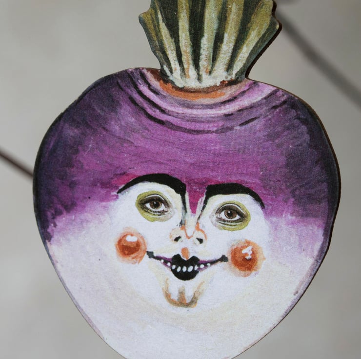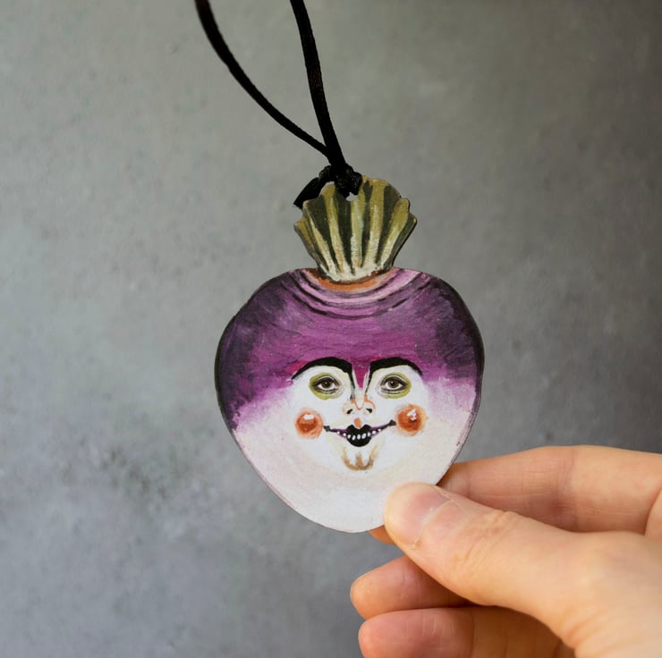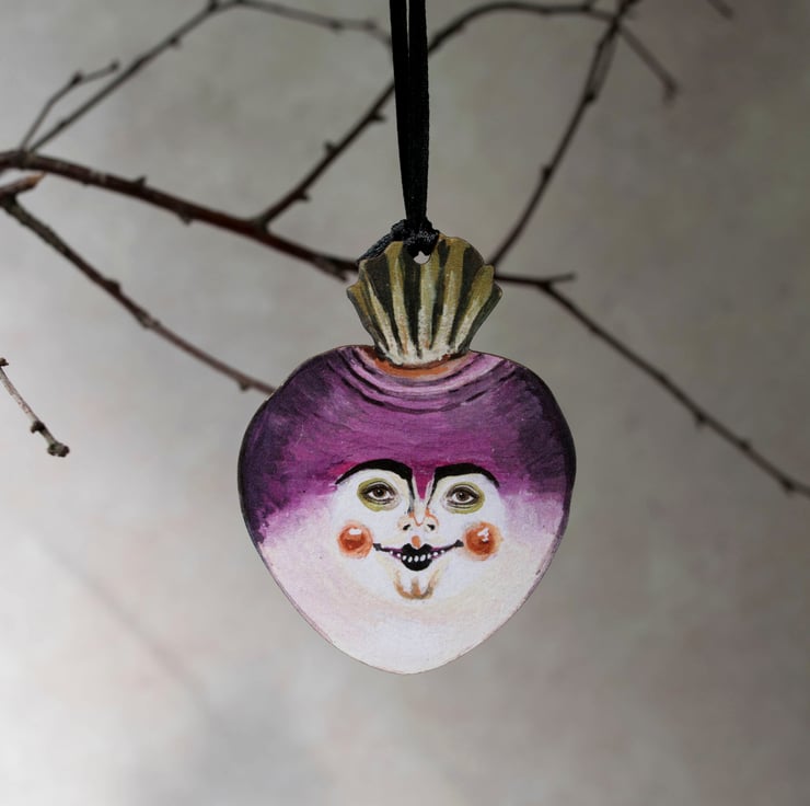 The turnip decoration was designed and illustrated by myself, and printed and laser cut within the UK. My name has been engraved on the reverse.