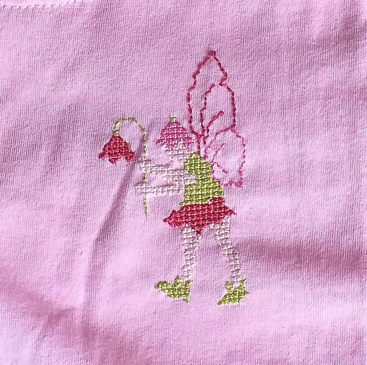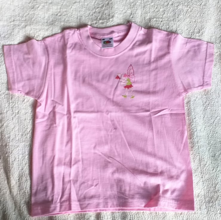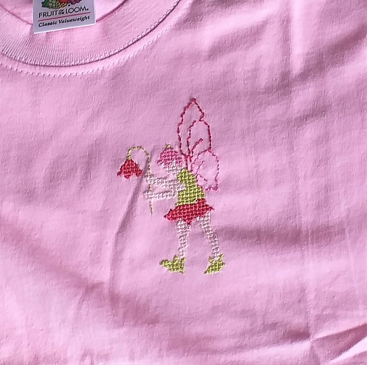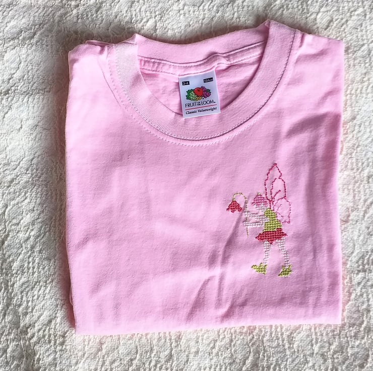 This is a light pink Fruit of the Loom short sleeved T-shirt (age 3-4) upon which I have hand-embroidered a fairy of my own design. It has variegated pink wings, wears green and pink and carries a deep pink flower. The shirt is 100% cotton and can be machine washed at 40C.
