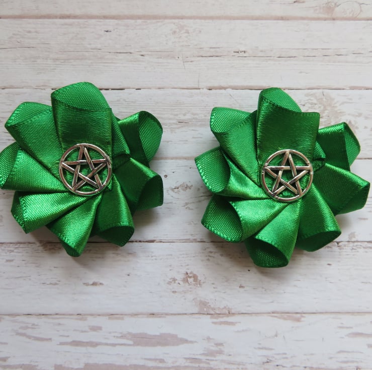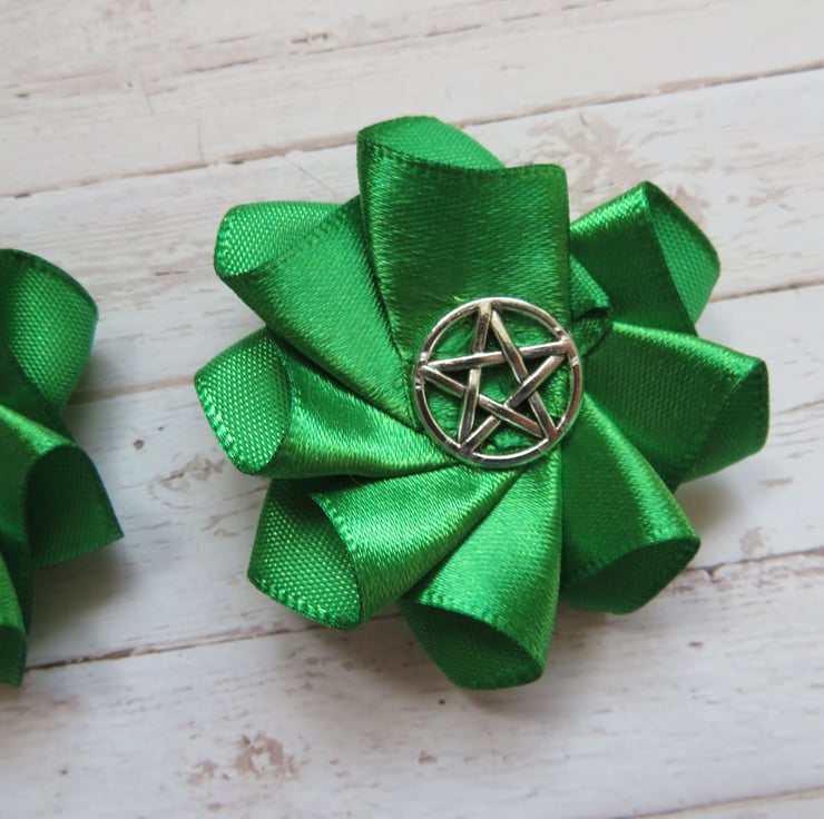 Created with a small emerald green single face satin ribbon ruffle with a silver (zinc alloy) pentagram charm.