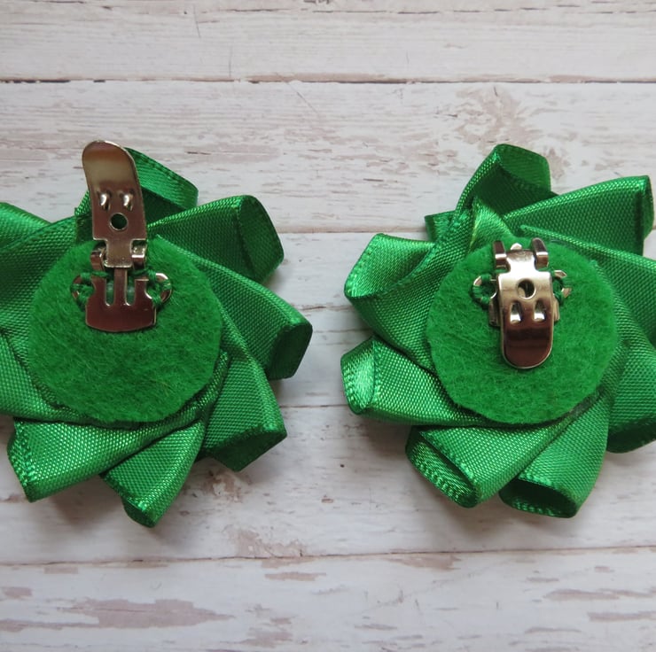 Backed with a small circle of emerald green felt, sewn onto the shoe clip.