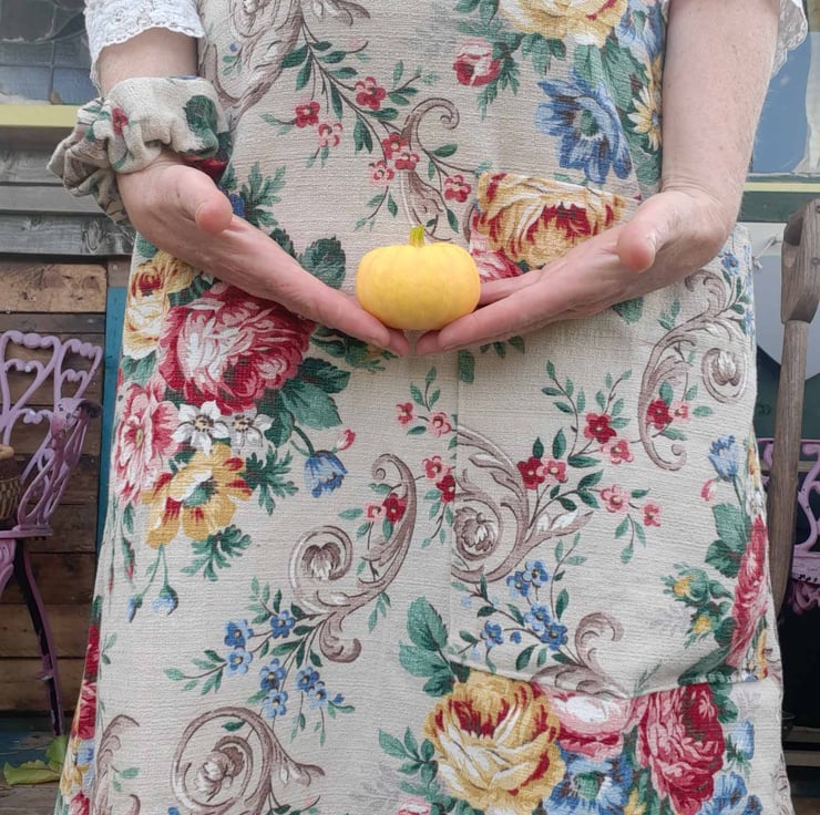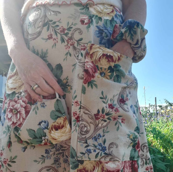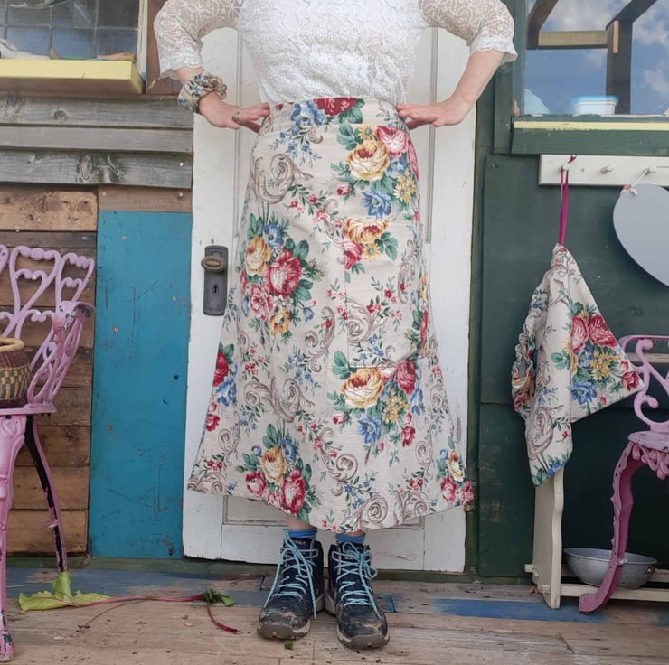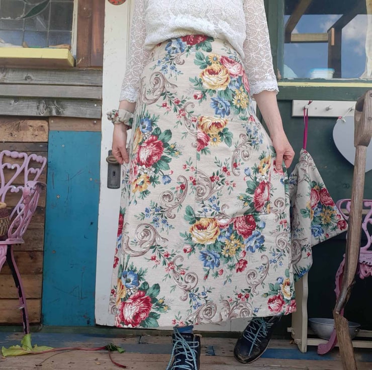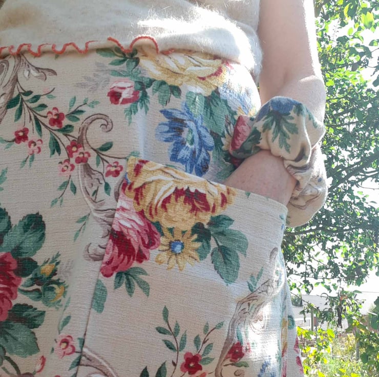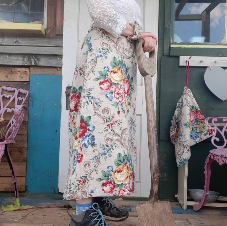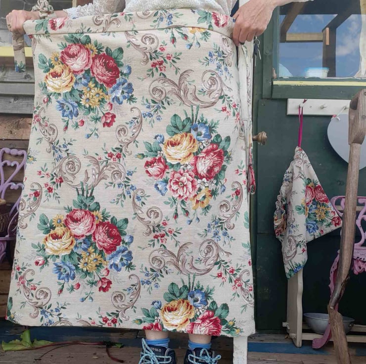 Such a pretty one this one on a thicker fabric too with matching bag mask and hair scrunchie. Size is adjustable as gathers at the back and flat at the front so very flattering. Fit 10 to 14 smaller you ate the more gather at the back . Has a very big over sized pocket. All seams are overlocked in side so very neat .