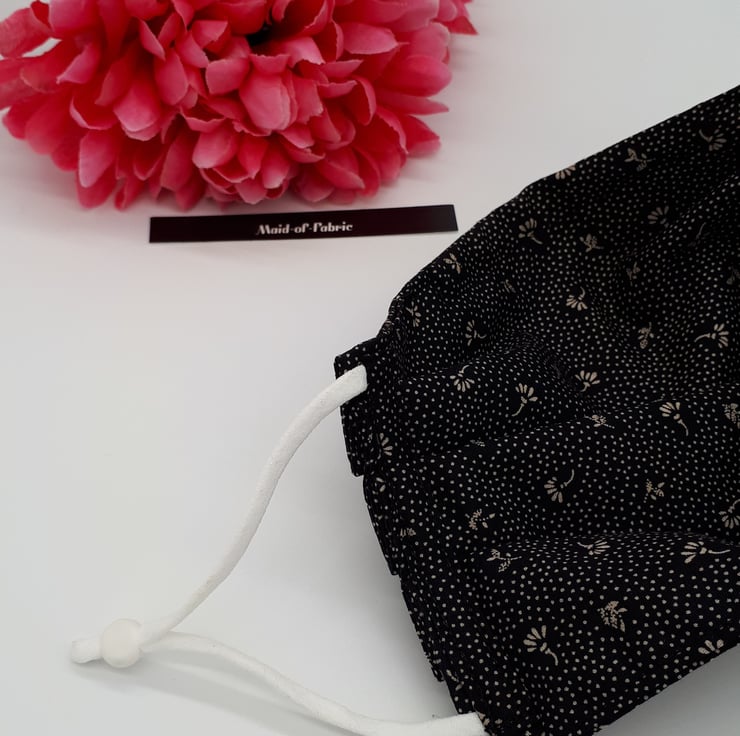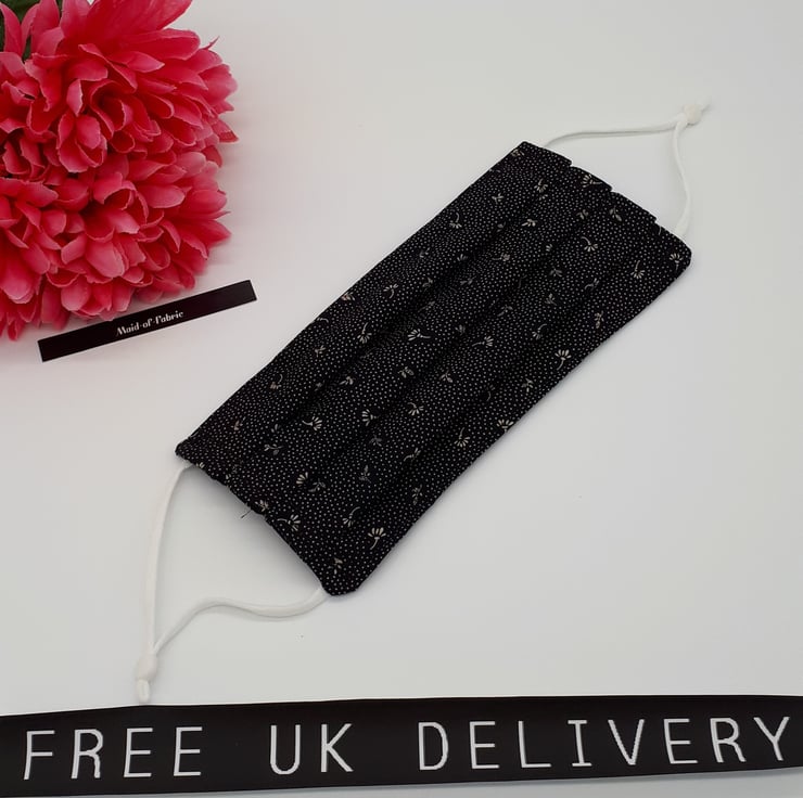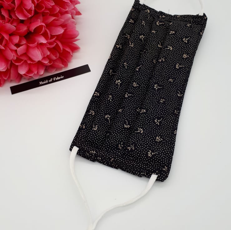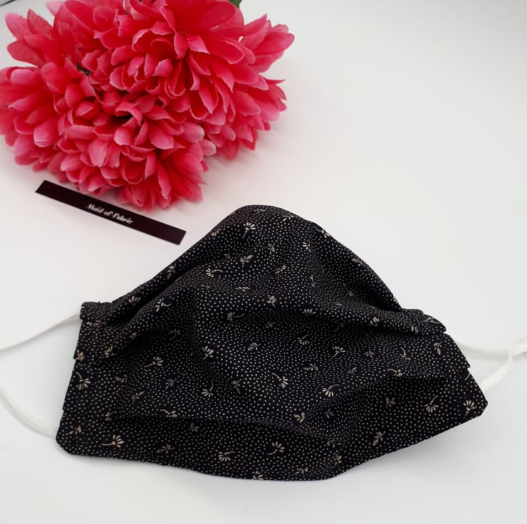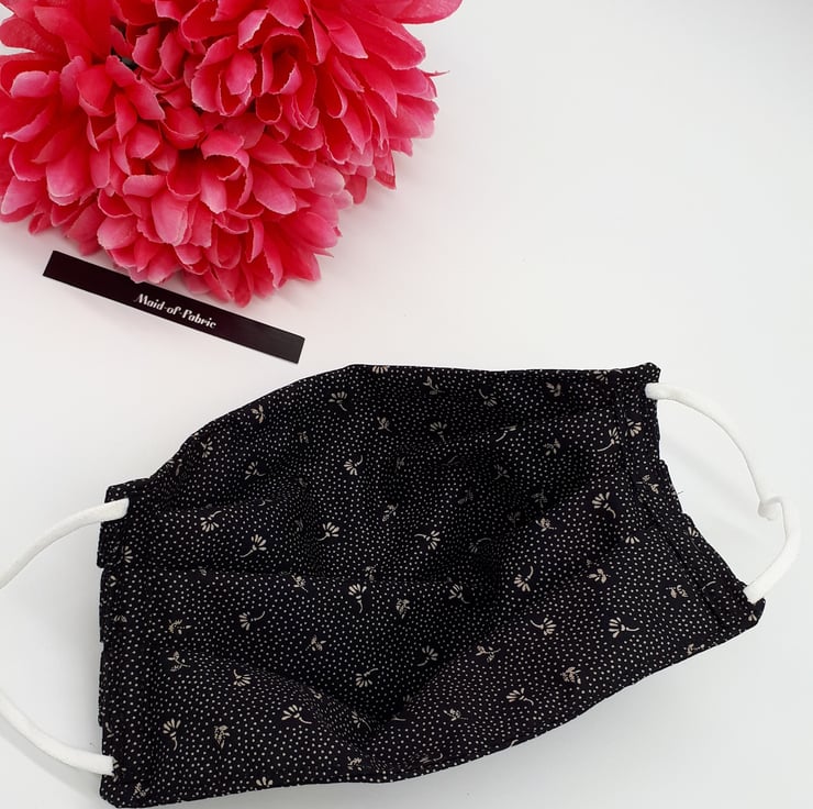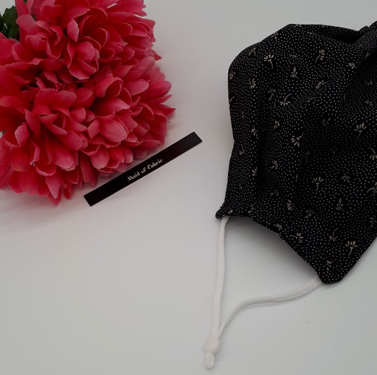 Face mask made using a soft black flower dot cotton fabric, white adjustable elastic and a 9cm flat nose wire.