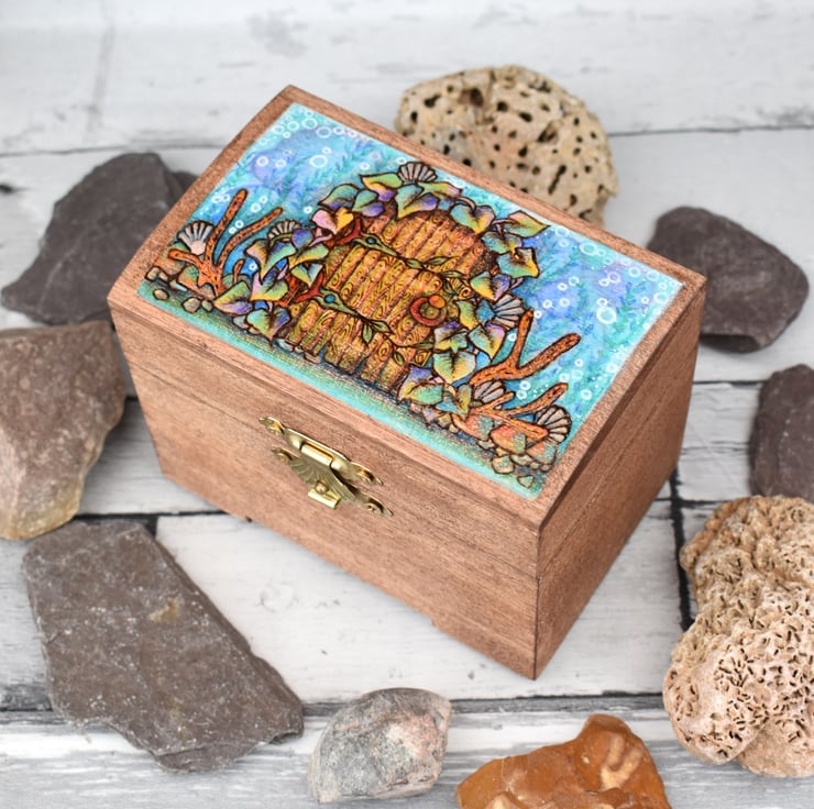 A door decorated with underwater treasures adorns this box, burned by hand using pyrography and then coloured using art pencils and paint.
