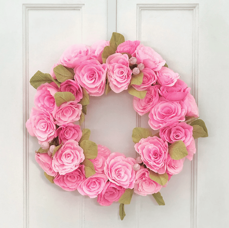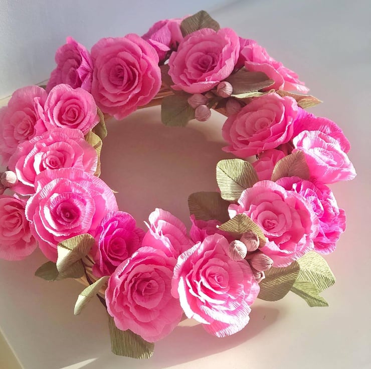 The flowers and leaves are made from premium Italian crepe paper which has brilliant colours and a texture that mimics nature. I hand cut the petals and leaves from this paper then shape them one by one to create unique dimensions. I put them together into flowers and leaf stems into metal wires covered in floral tape. After creating the individual blooms and foliage, I arrange them on a base of willow wreath and finally secure in place with the help of hot glue sticks.