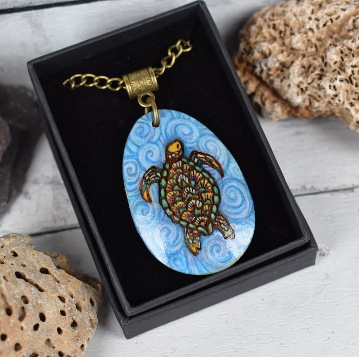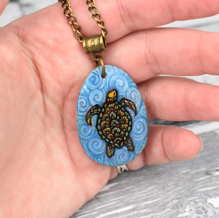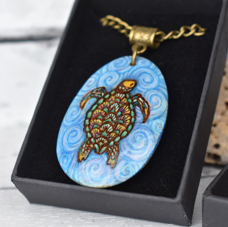 A sea turtle swimming in the sea on this teardrop shaped pendant. Hand burned using pyrography or wood burning. Coloured with art pencils. Ideal for a sea life fan or a five year wood anniversary gift.